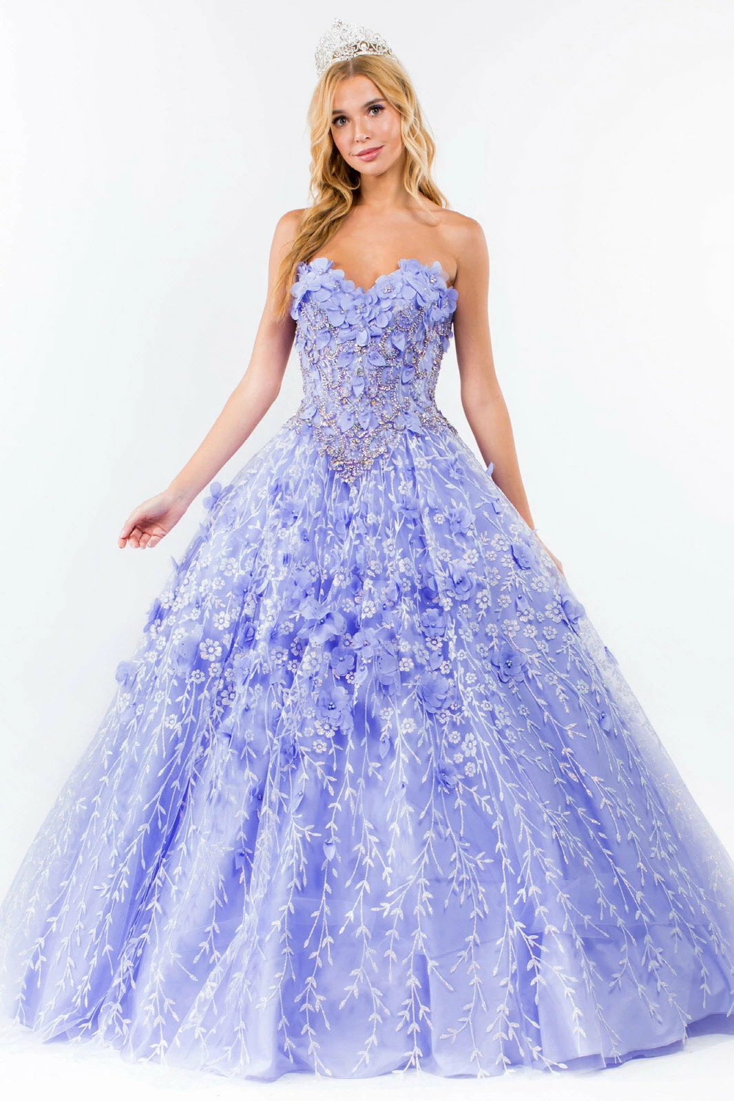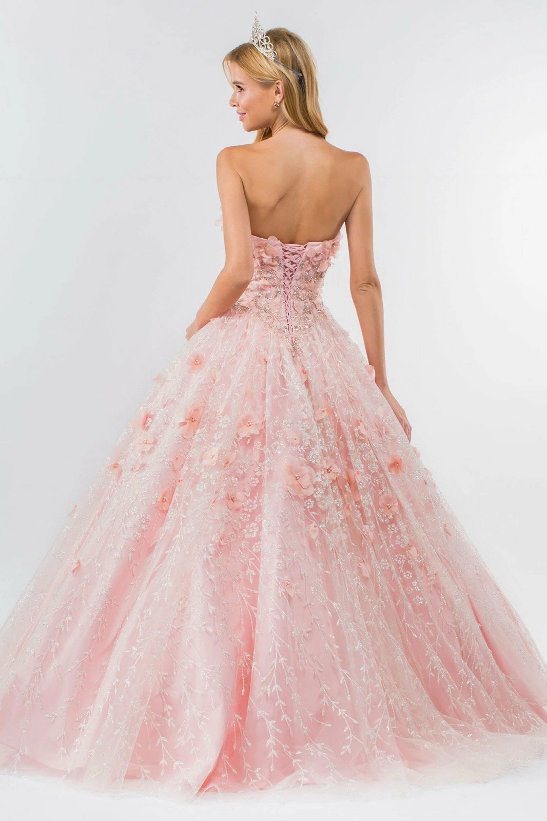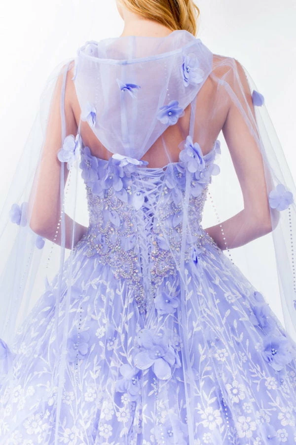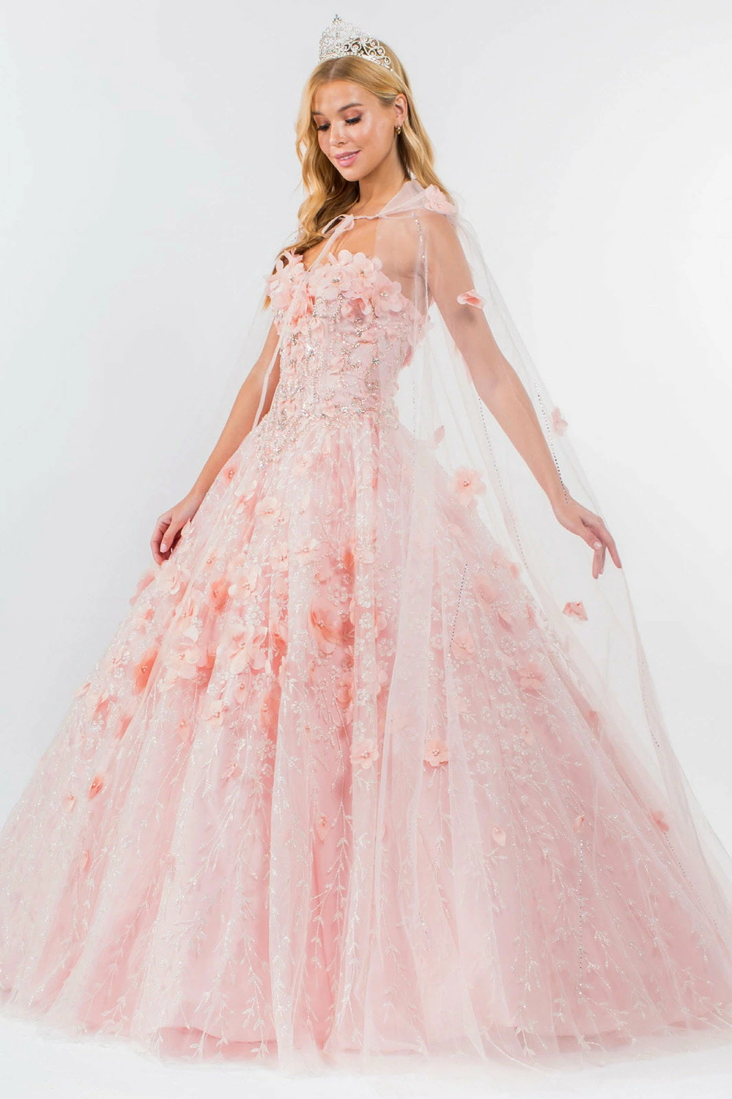 Make a grand entrance in this 3D floral embroidered long strapless cape dress with A-line skirt by Elizabeth K GL1939. Spectacular Quinceanera dress with sweetheart neckline, decorated with sparkly jewels, beads, and 3-D floral applique on the bodice. It features a floor long mesh cape decorated with 3-D flower appliques.