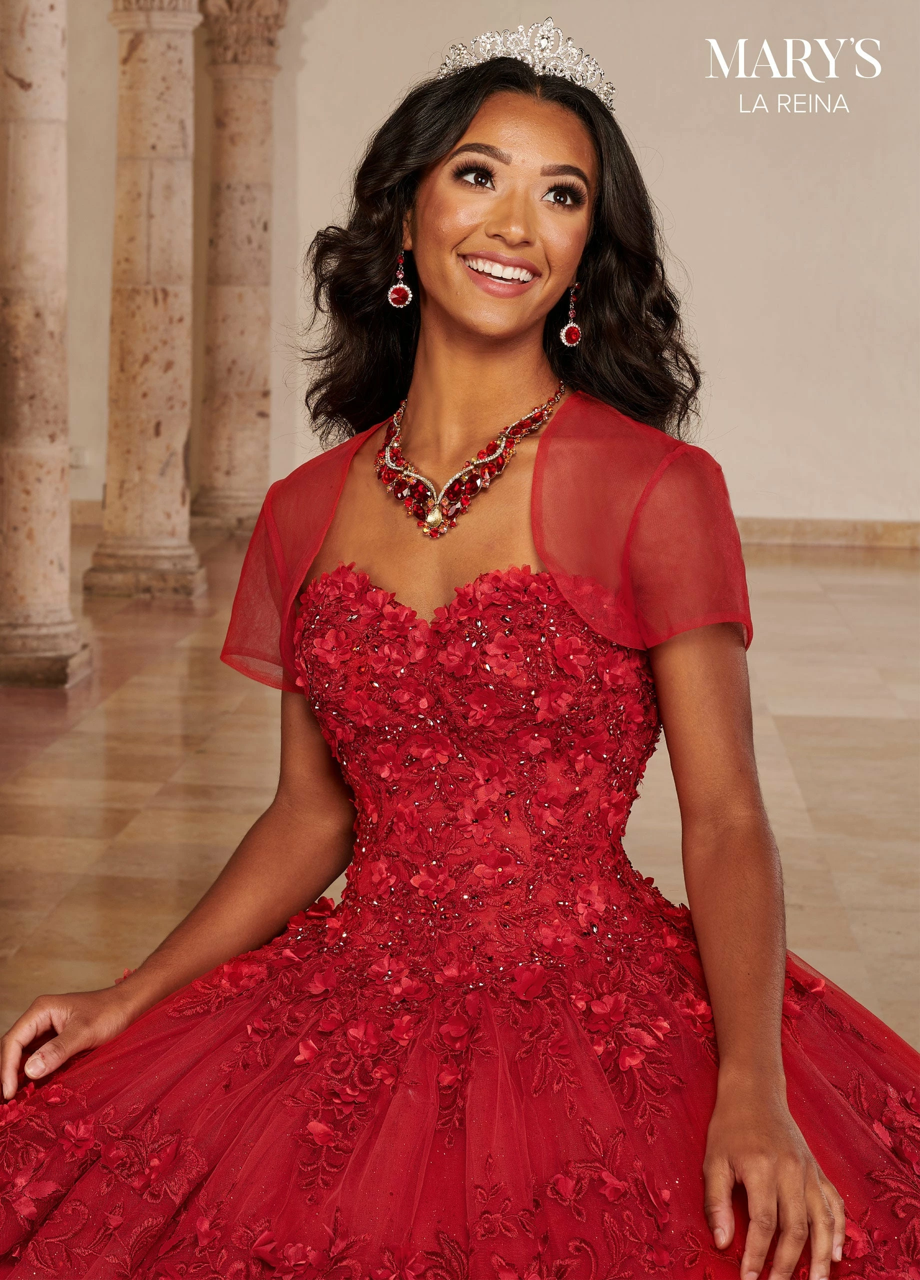 Captivate the room in this 3D floral applique long strapless dress with A-line skirt by Mary’s Bridal Quinceanera MQ2145. This strapless glitter tulle quinceanera ball gown features a sweetheart neckline, detachable shoulder straps, lace applique, beading, 3D flowers, lace-up back closure, and a sweep train. Bolero jacket is included.