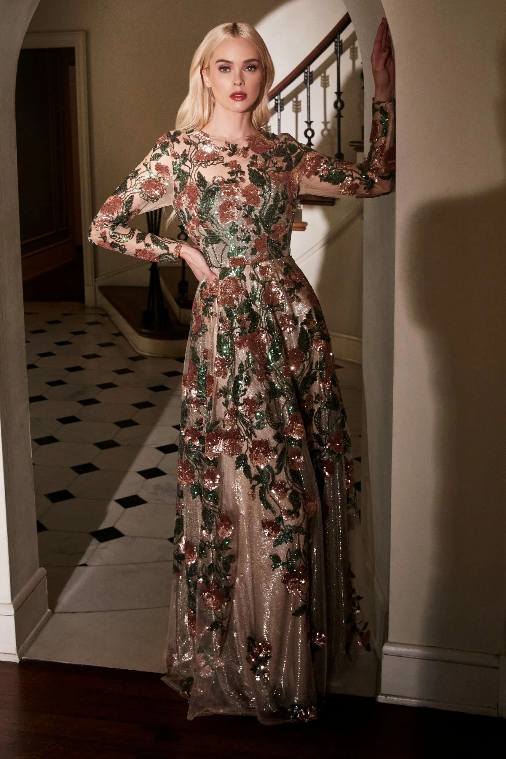 Look modest chic in this floral sequined lace long sleeve dress with A-line skirt by Andrea & Leo A0926.