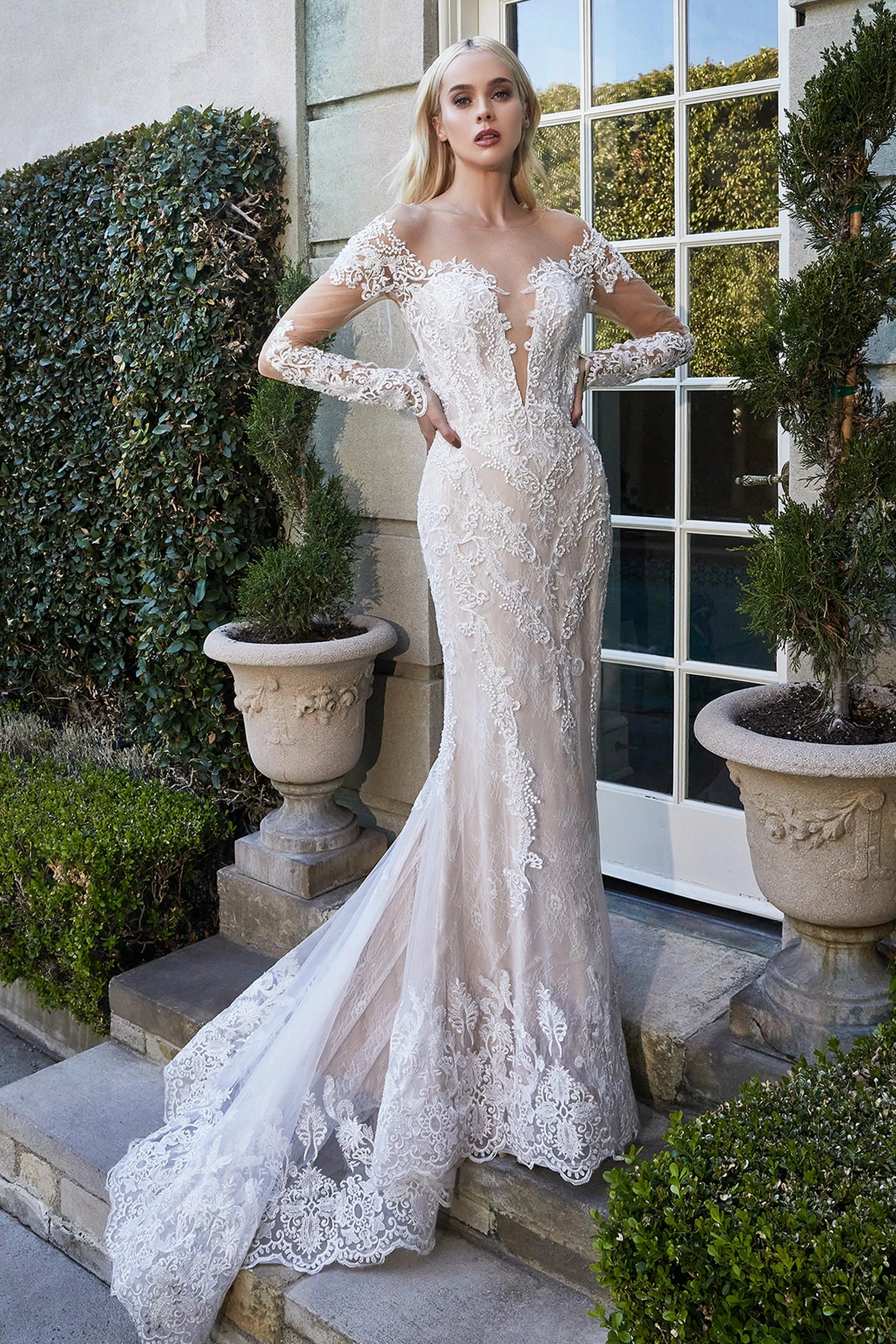 - Illusion deep V-neck bodice secured with sheer full length sleeves