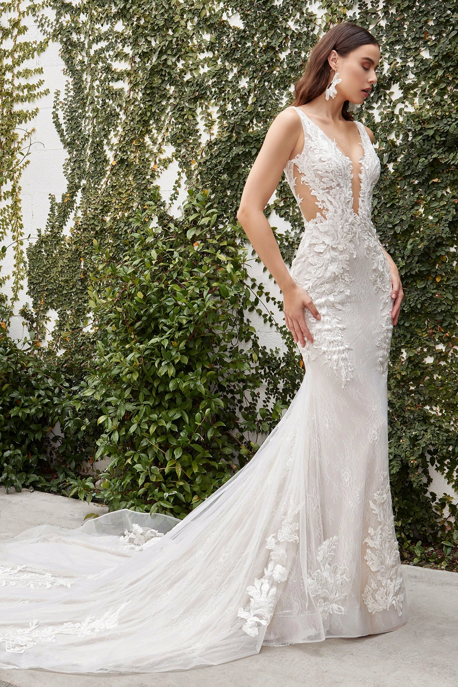 Captivate the room in this white long sleeveless lace dress with fitted skirt by Andrea & Leo A1072W. Bring your romantic visions to life in this fitted mermaid lace gown. The Avery features expressionistic floral lace applique beautifully placed on chantilly lace. The mermaid silhouette is form-flattering with a sophisticated lace-edge V-neckline with waist-slimming sheer side detail. The Avery is a head-to-toe stunner that makes a grand entrance as well as exit with its elongated tulle train.