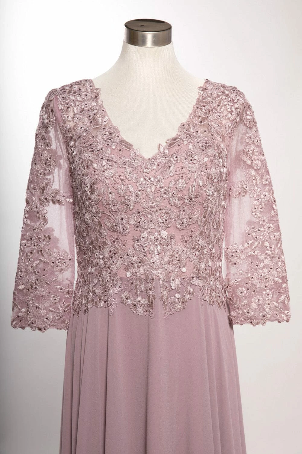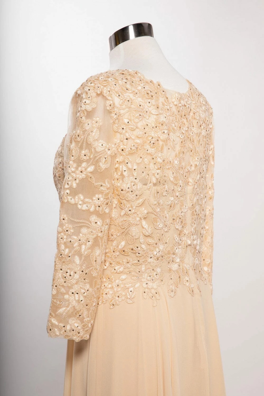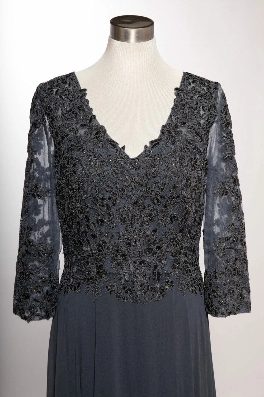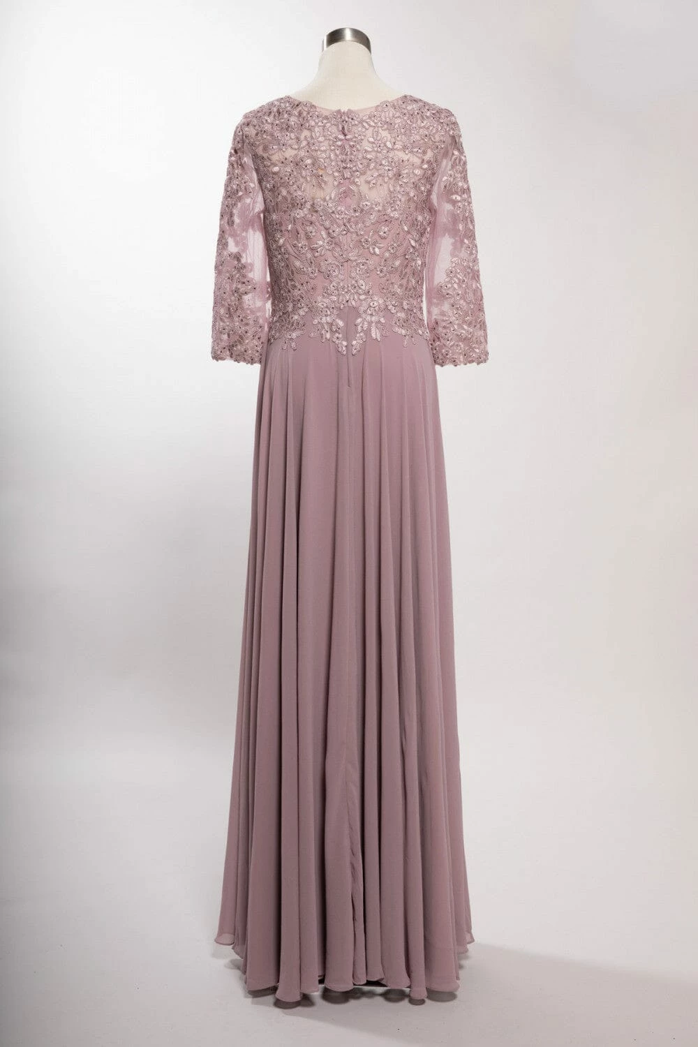 Look timeless in this beaded lace applique long 3/4 sleeve dress with A-line chiffon skirt from Coya Collection by Aspeed Design M2758Q.