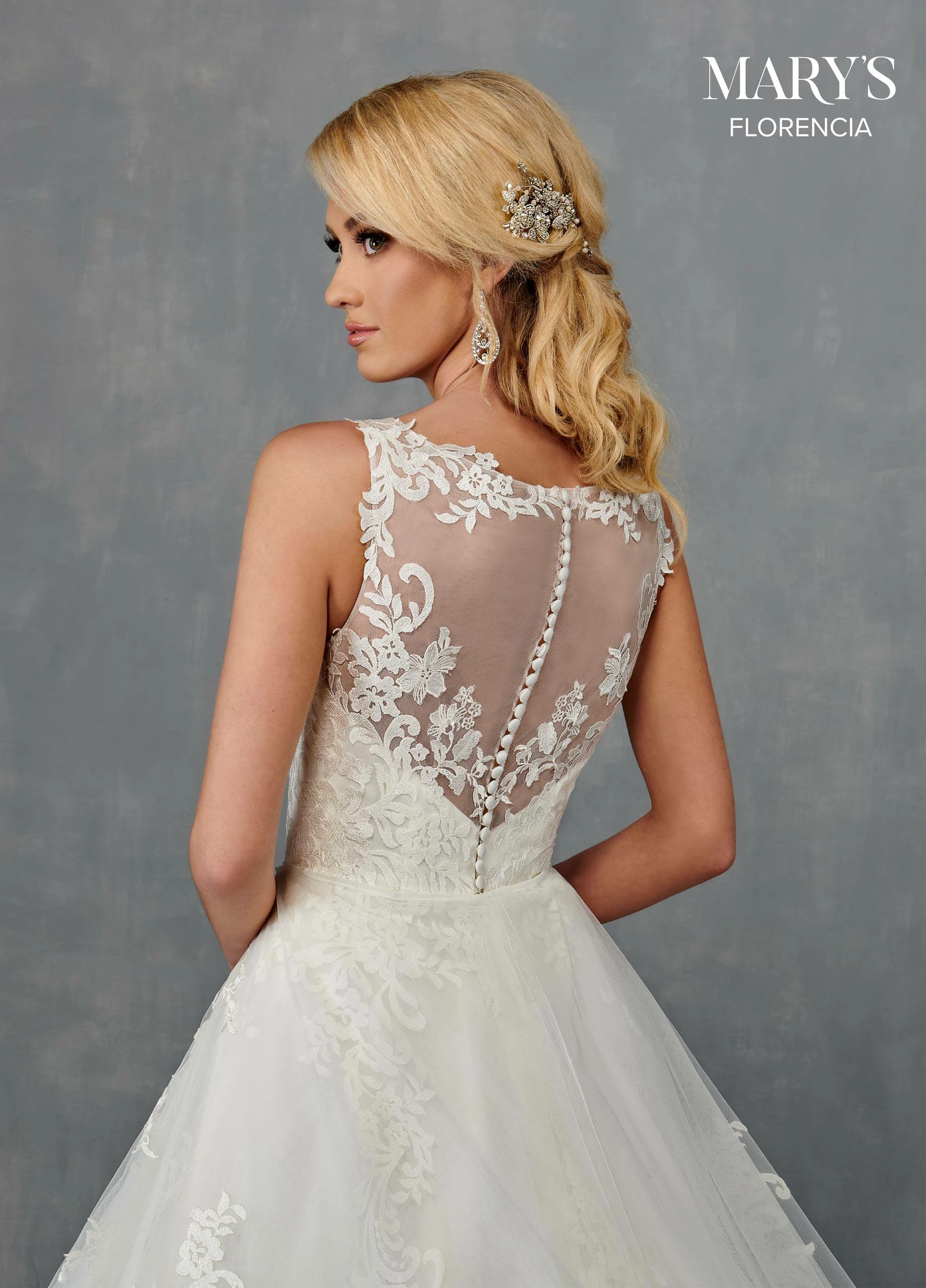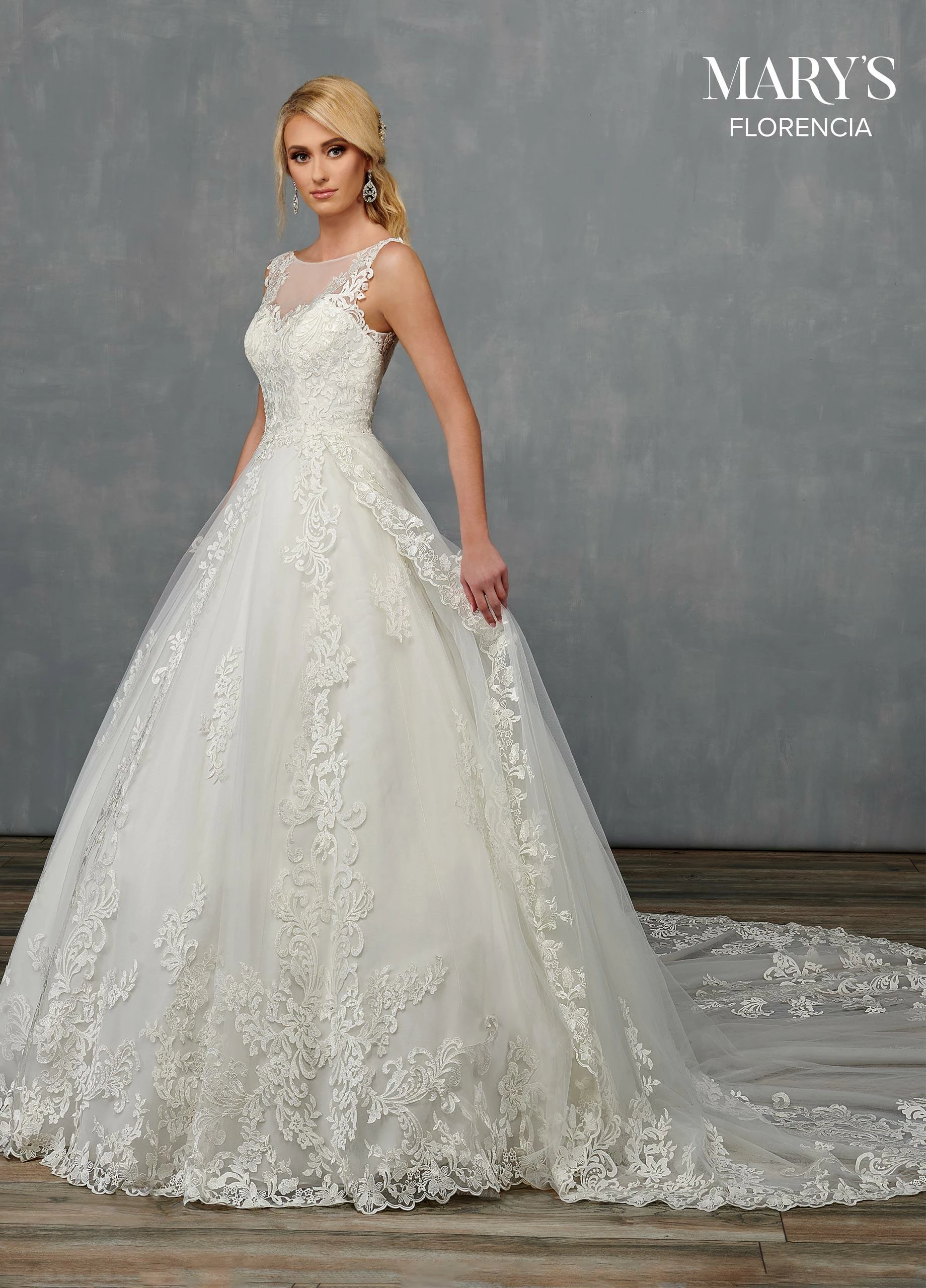 Look radiant in this long sleeveless wedding dress with A-line skirt by Mary’s Bridal Florencia Collection MB3115. Traditional A-line wedding dress with a sheer cap sleeve yoke and delicate lace applique throughout. The floor length gown has been adorned throughout with matching lace applique. The gown finishes with a sheer back yoke, covered button closure and a full semi-cathedral length detachable train accented with matching applique.