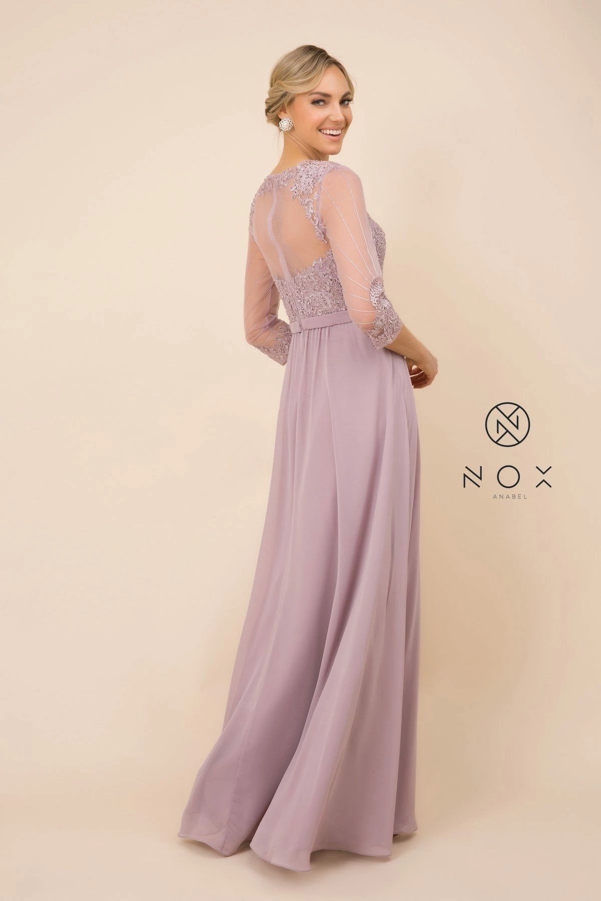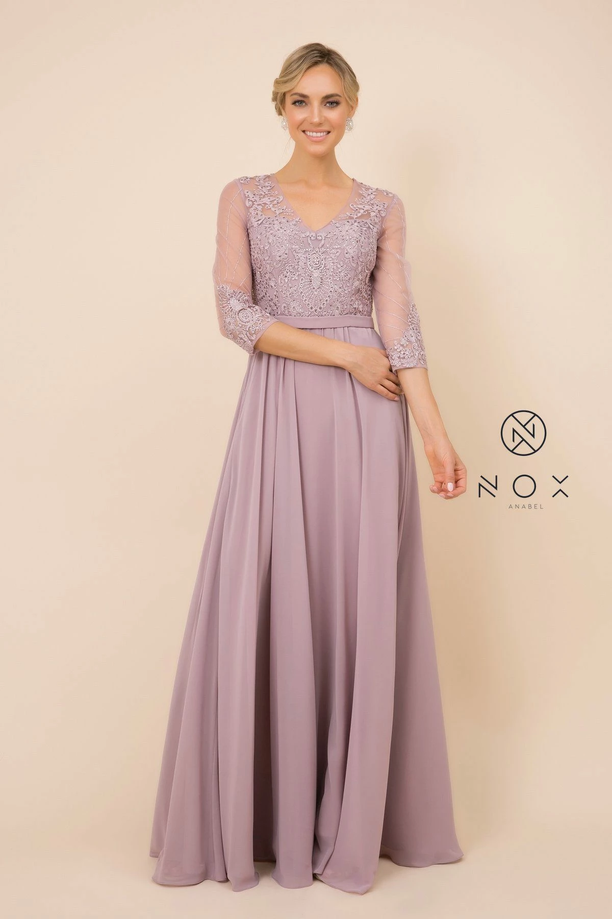 Receive lots of compliments in this embroidered applique long chiffon 3/4 sleeve dress with A-line skirt by Nox Anabel Y532.