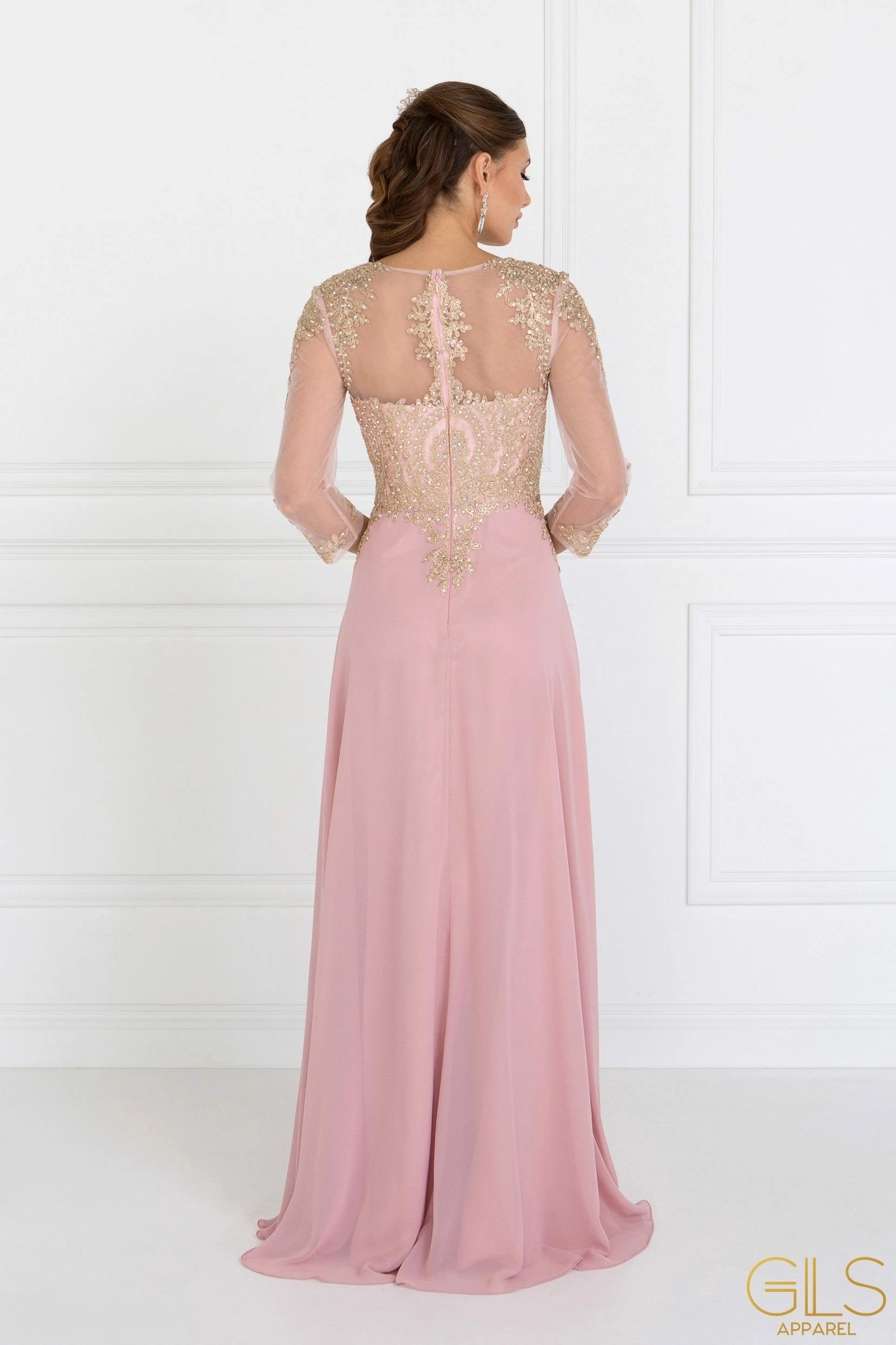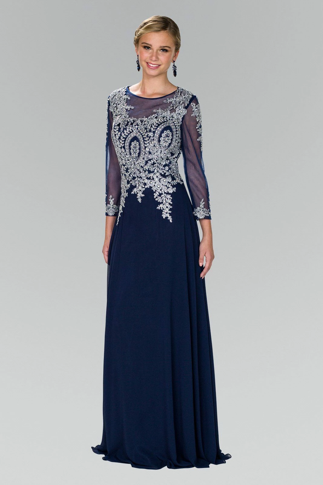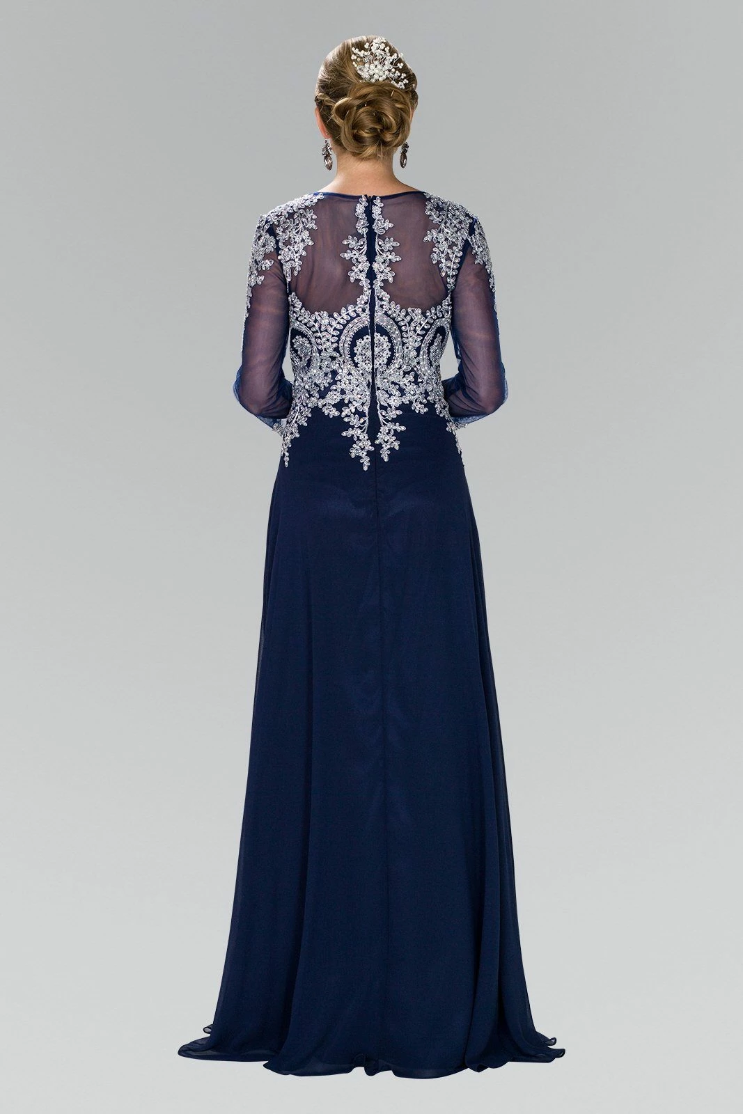 Look chic yet modest in this long sleeve dress with lace appliques by Elizabeth K GL1368. Long sleeve lace embellished dress with a boat neckline on a trumpet silhouette. Has full bold embroidery work on front and back. Sheer panel back with zipper close.