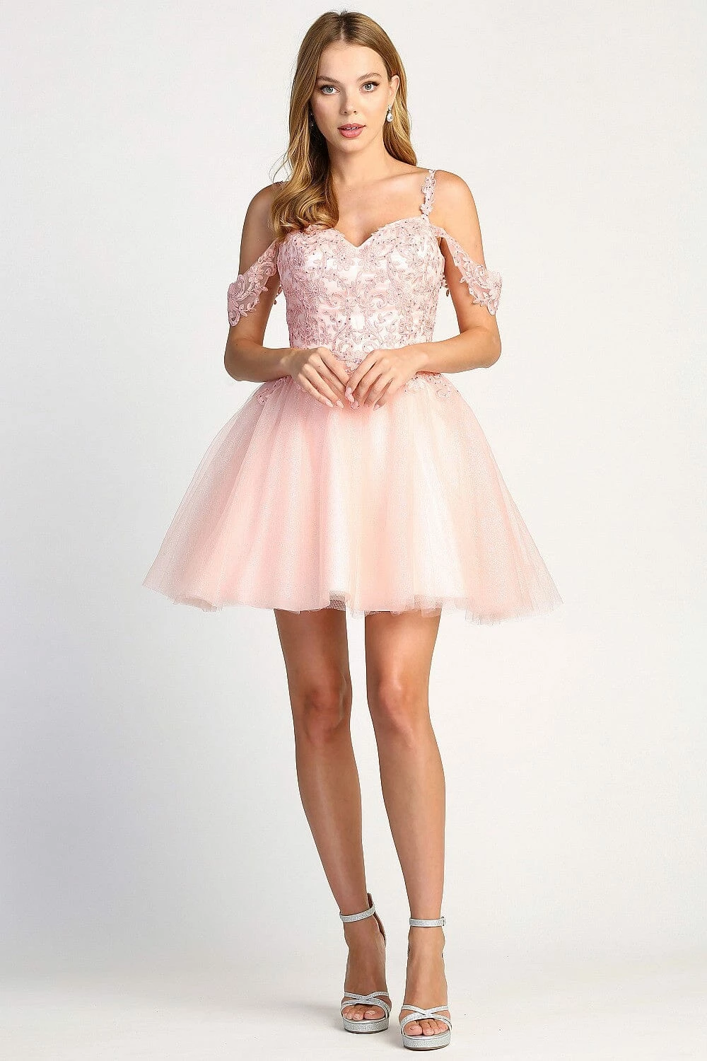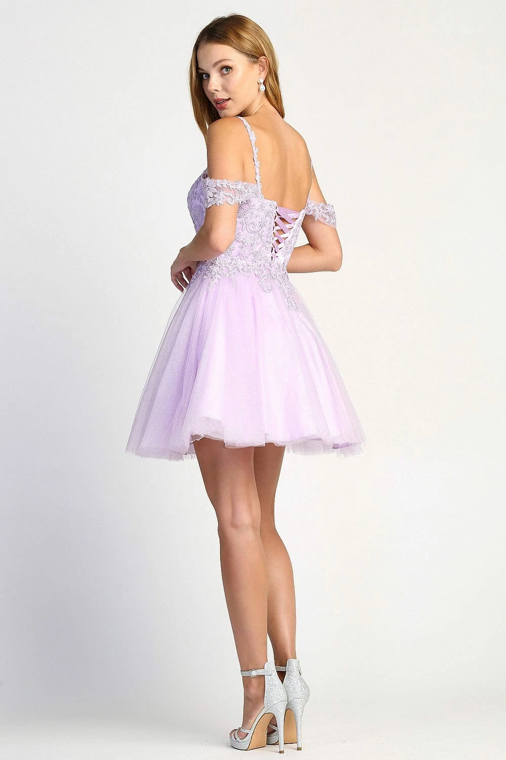 Look picture-perfect in this embroidered lace applique short cold shoulder dress with A-line glitter tulle skirt by Adora Design 1006.