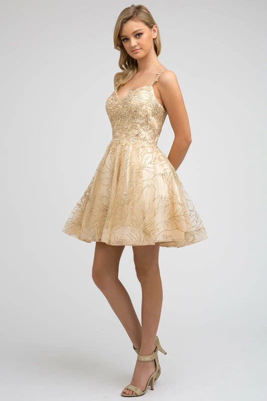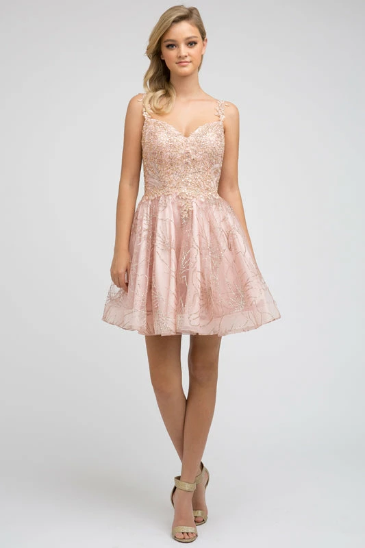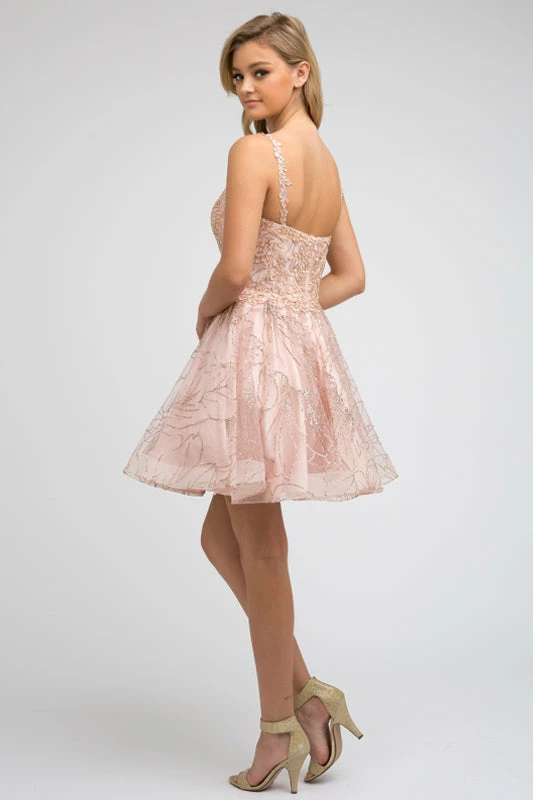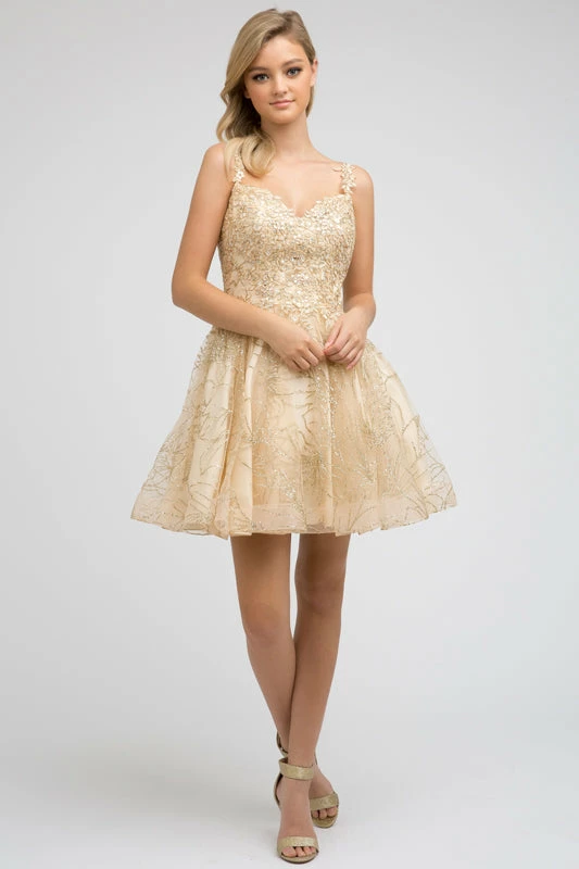 You’ll love twirling around in this appliqued short sleeveless sweetheart dress with A-line glitter print skirt by Juliet 838.