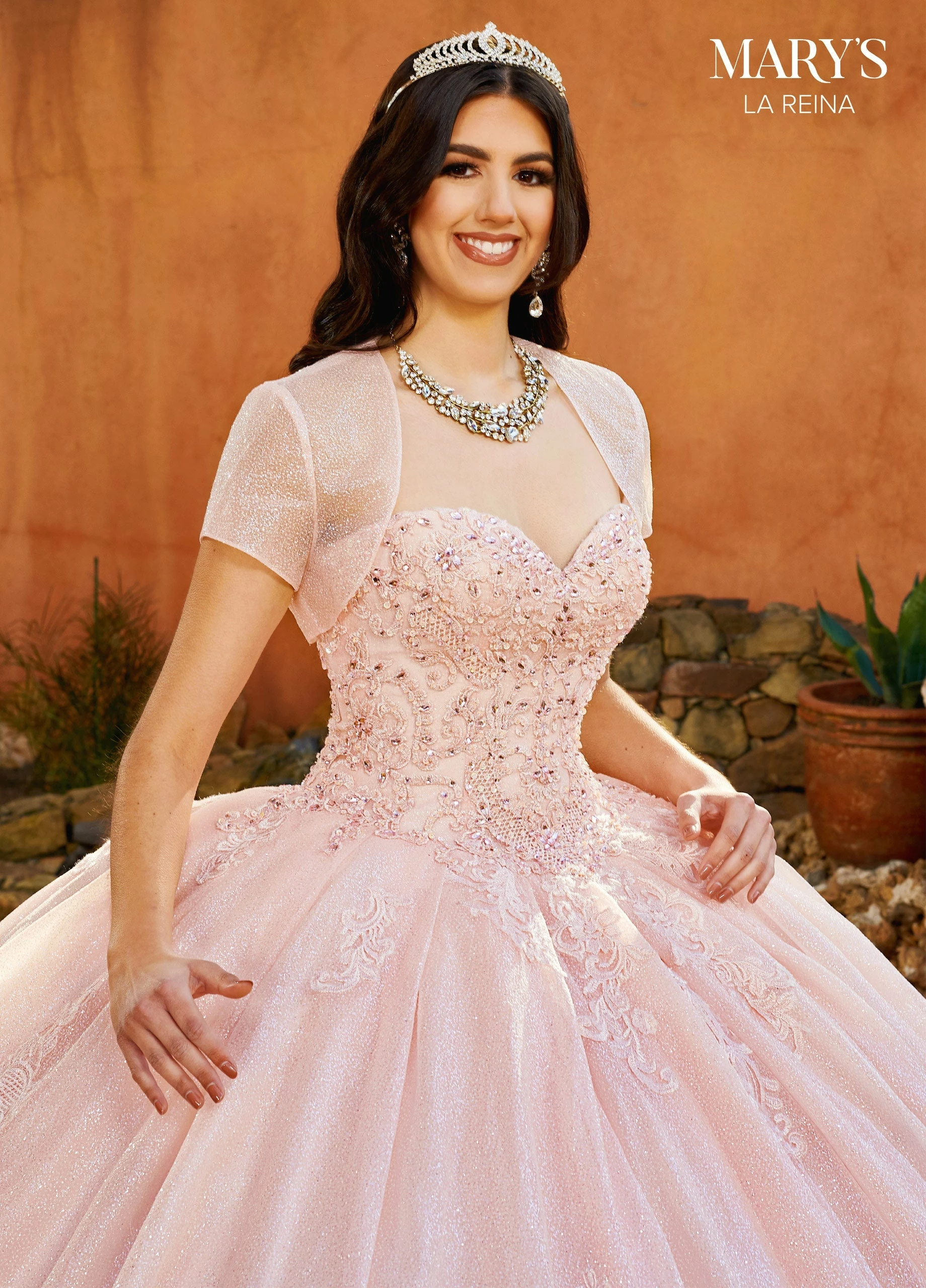 Receive lots of compliments in this long strapless tulle dress with A-line skirt by Mary’s Bridal Quinceanera MQ2156. This strapless glitter tulle quinceanera ball gown features a sweetheart neck line, detachable long fitted sleeves, beading detail, lace applique, pleated skirt with scallop train, lace-up back closure. Matching tulle bolero jacket is included.