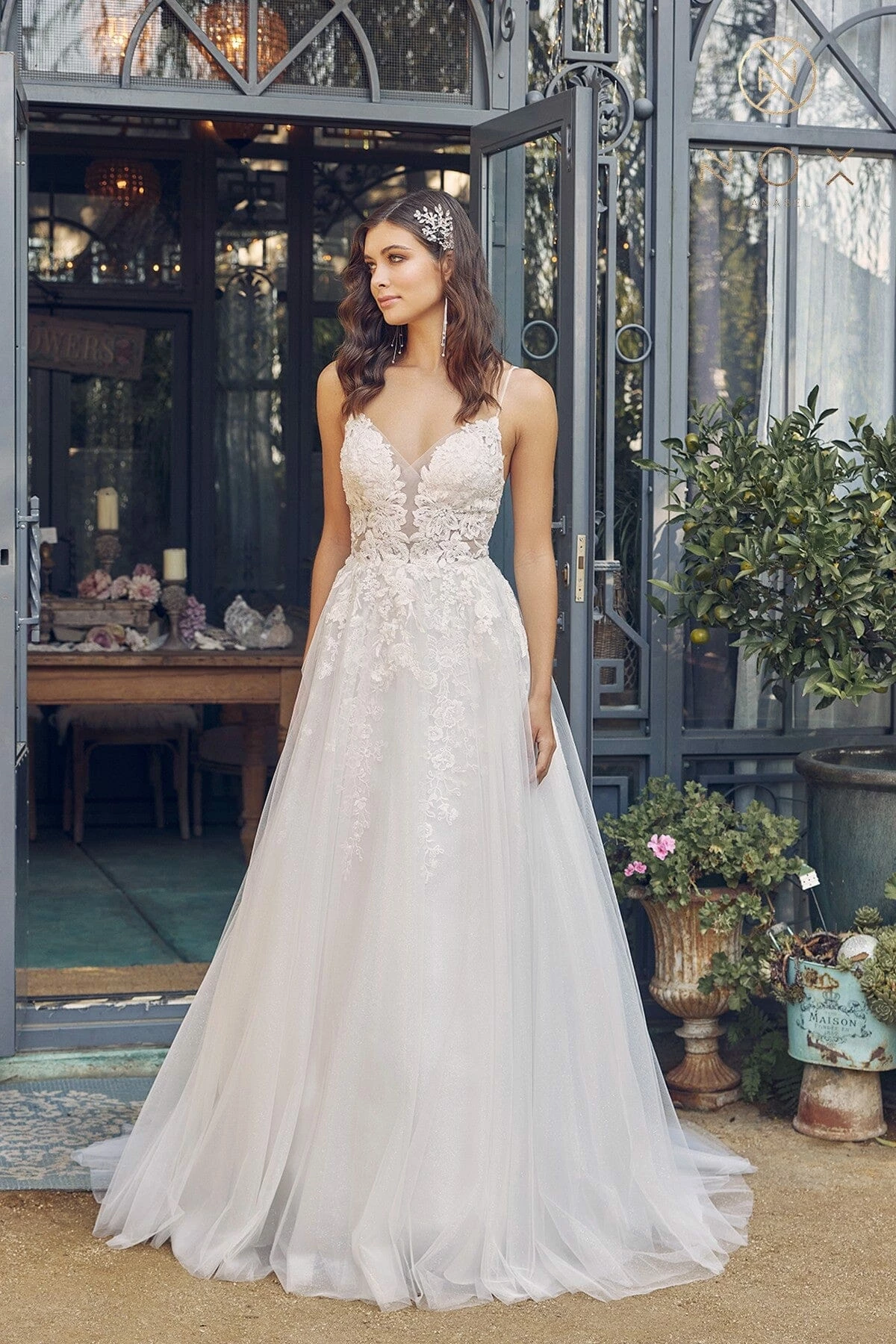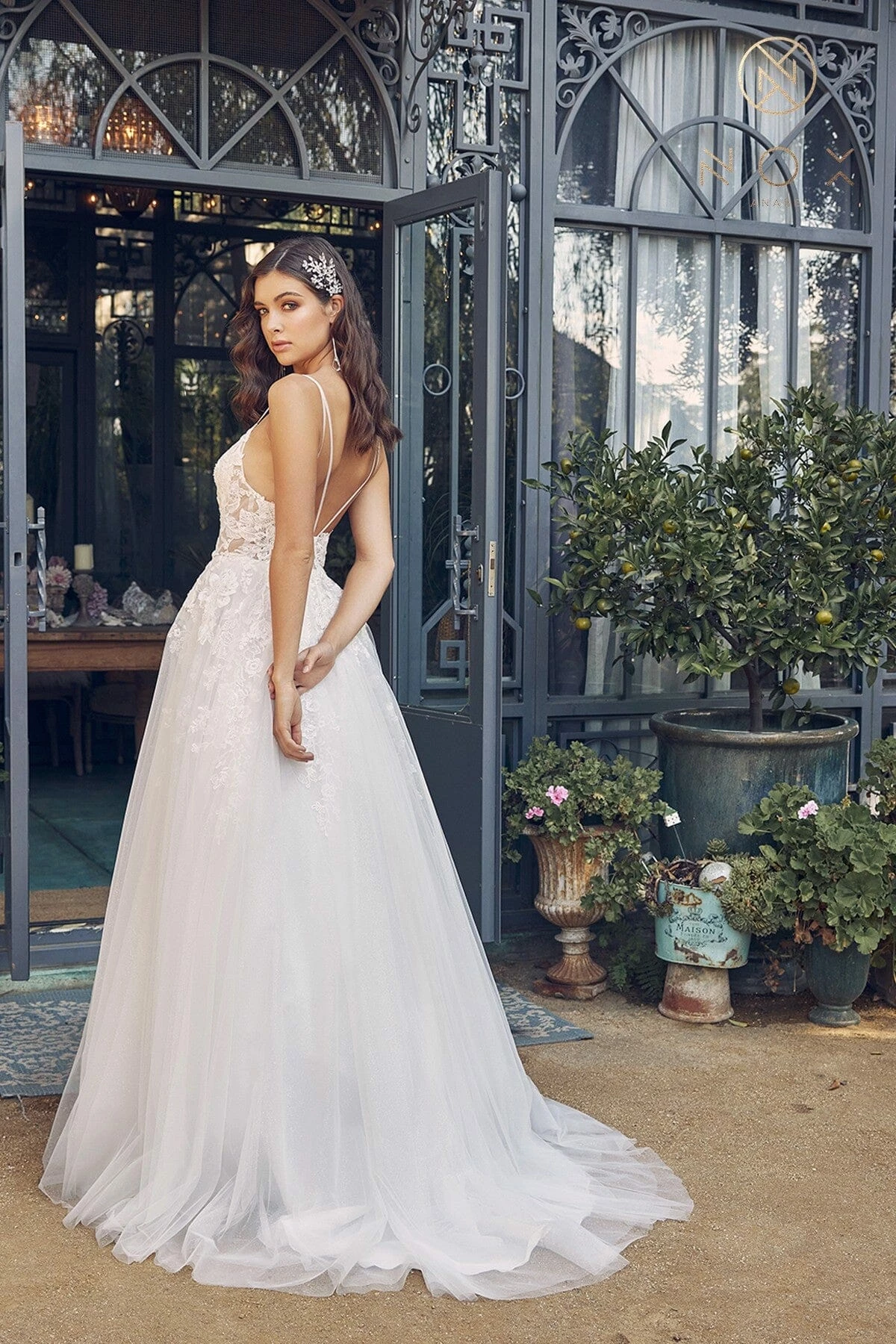 - Floral Applique V-Neck Wedding Dress by Nox Anabel JE933