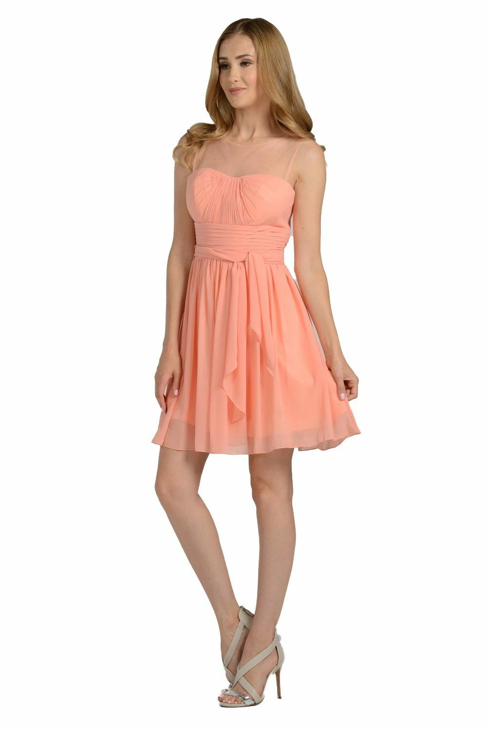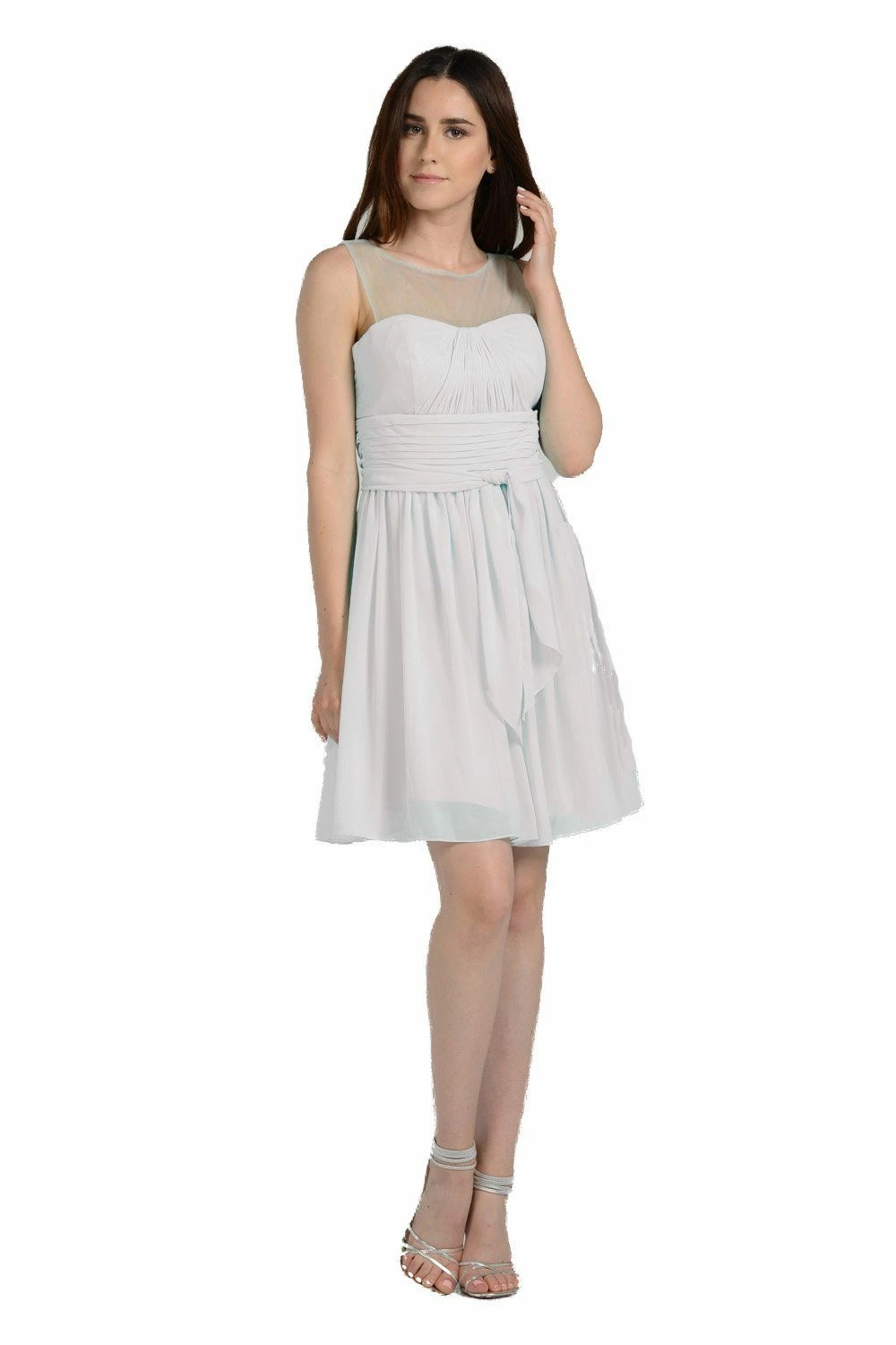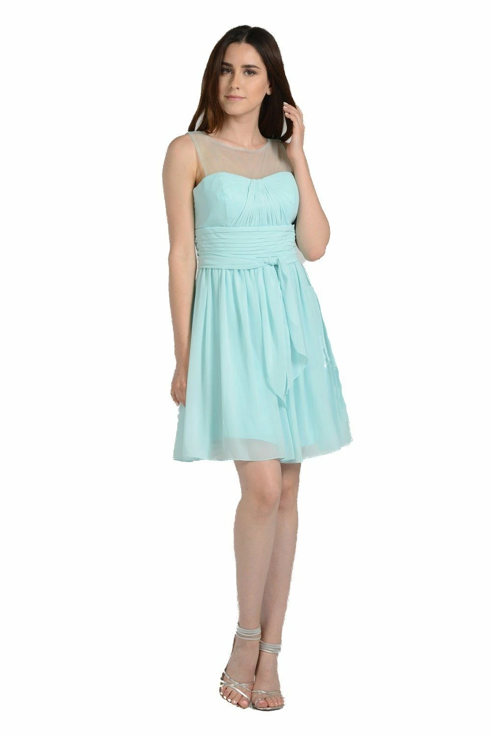 Look lovely in this short sleeveless aqua chiffon dress with bow by Poly USA Style Number 7006. This sleeveless dress features an illusion neckline and ruched bodice. This beautiful dress is adorned with a cute bow on the waist and a gathered short A-line skirt. Affordably priced under $100, this versatile short party dress is perfect for bridesmaids, cocktail parties, and for homecoming dances!