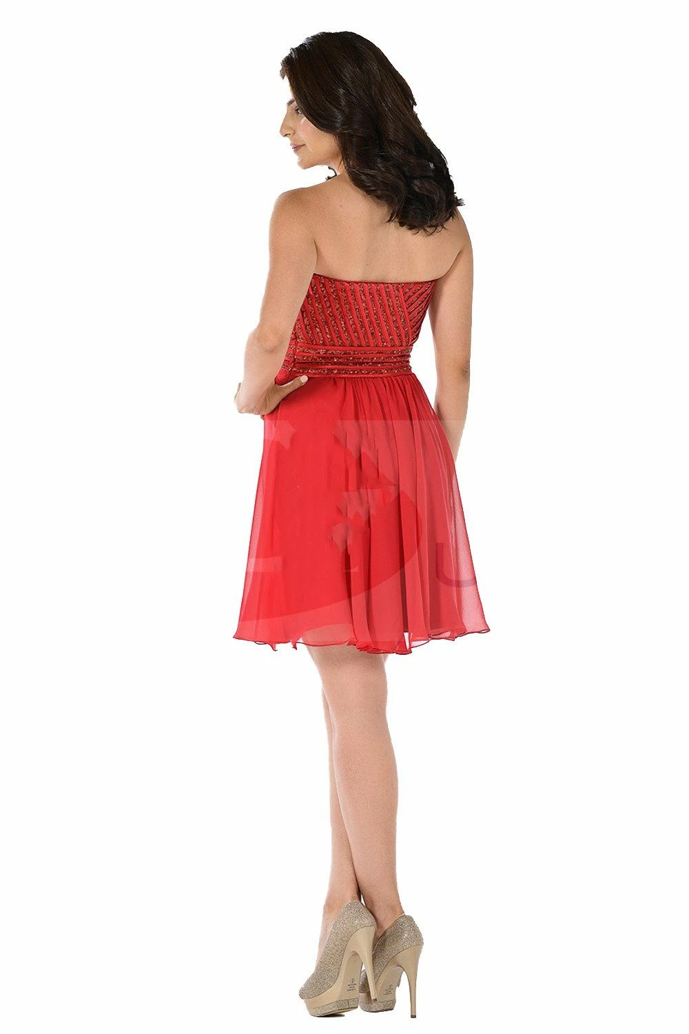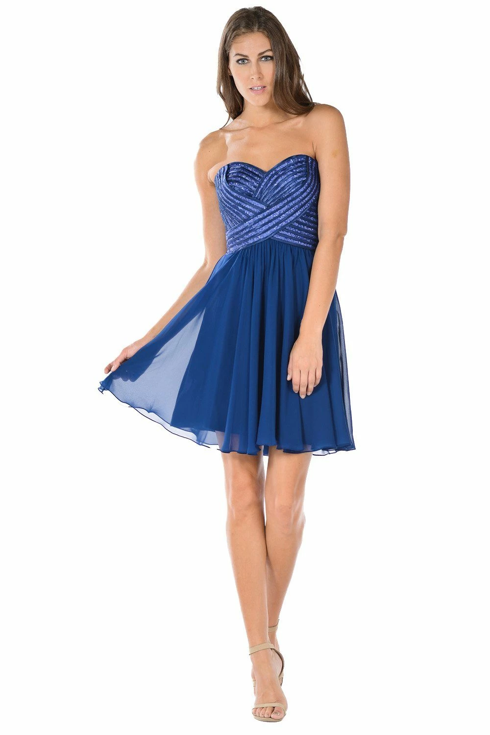 Be a trendsetter in this short strapless aqua dress with sequined sweetheart bodice by Poly USA 7716. This chiffon cocktail dress features a strapless sweetheart neckline adorned with sequins and satin stripes. An embellished back, short A-line skirt, and a zipper closure complete this beautiful look. Affordably priced at $150, this dress is perfect for any formal event and will keep you on budget!