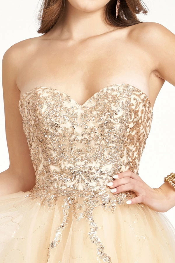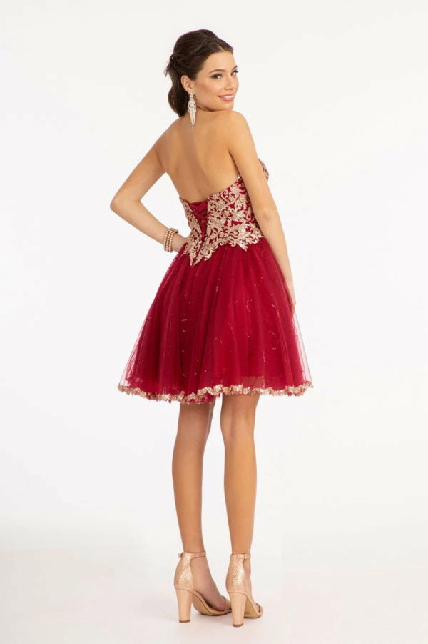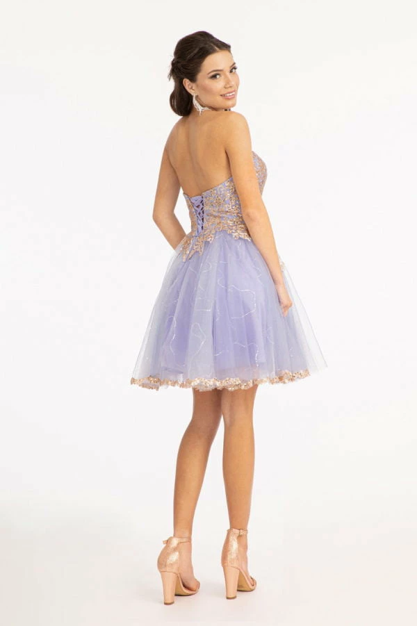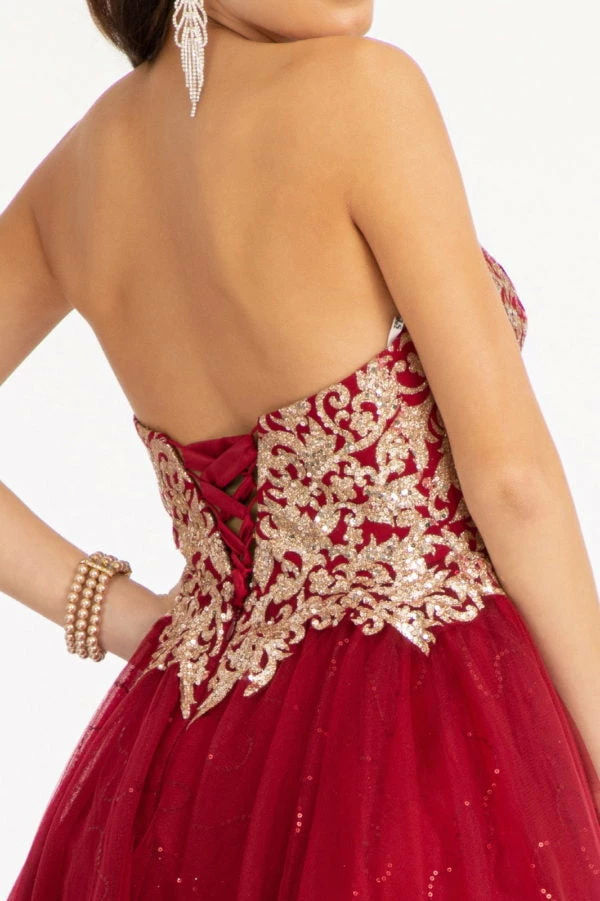 All eyes will be on you in this beaded short sweetheart dress with A-line skirt by Elizabeth K GS1980. For the most cutest girl in the world! This sequin embellished mesh short dress is decorated with sparkly glitter in splendid pattern. Strapless sweetheart neckline add romantic touch, and wide open lace-up back offers chic vibe to your look.