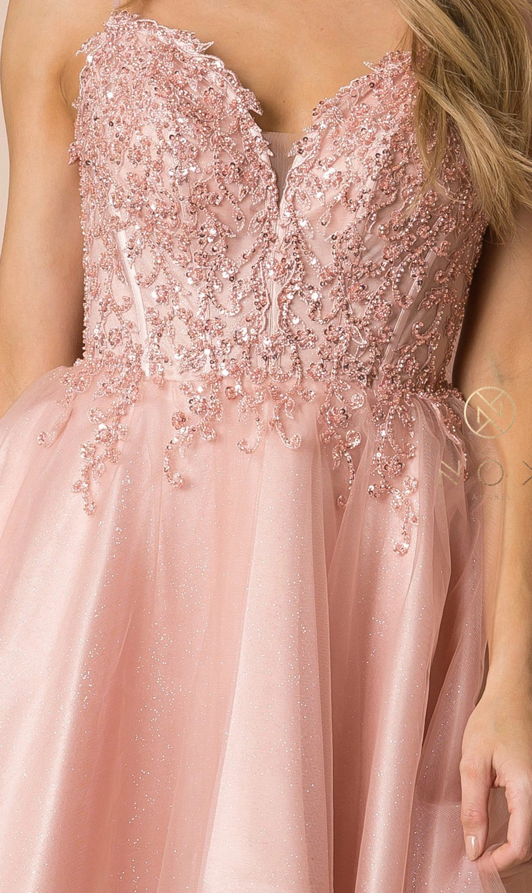 You’ll love twirling around in this beaded short sleeveless sweetheart dress with A-line skirt by Nox Anabel F732.