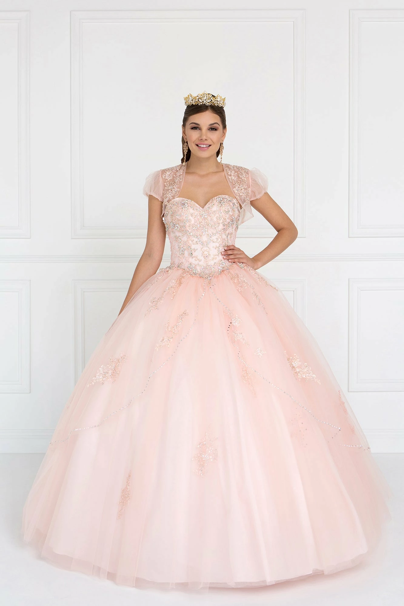 All eyes will be on you in this beaded strapless A-line dress by Elizabeth K Style GL2427. This beautiful gown features a strapless sweetheart neckline, delicate beading is embellished all throughout, long A-line skirt accented with beads, and a lace-up back. This gown comes with a matching bolero jacket.