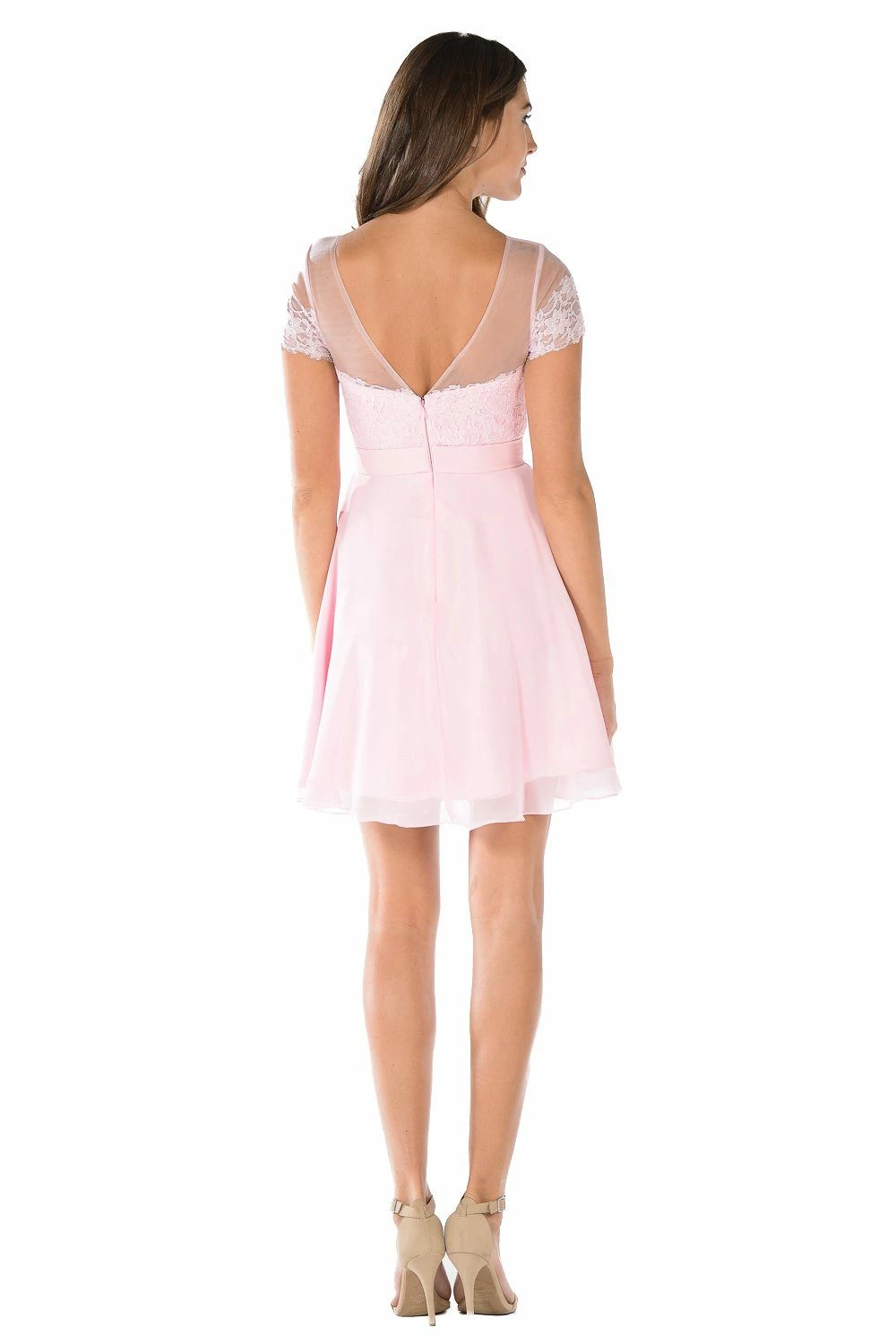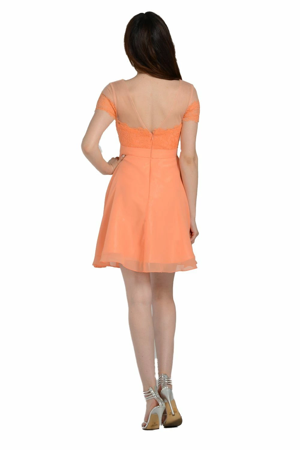 Receive lots of compliments in this short orange dress with illusion lace short-sleeved bodice by Poly USA Style Number 7518. This cocktail dress features a short-sleeved illusion bodice embellished with lace appliques. A flirty sheer open V-shaped back, a short A-line skirt, and a zipper closure complete this beautiful look. Affordably priced under $150, this dress is perfect for any formal event and will keep you on budget!