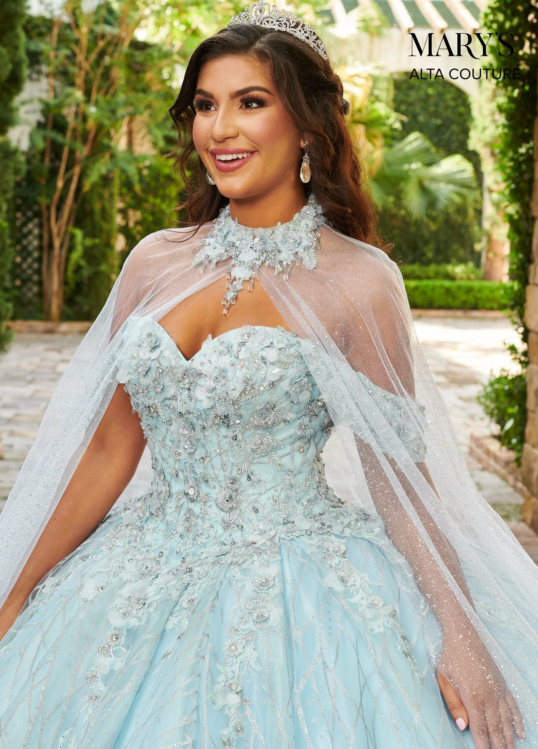 Make a grand entrance in this beaded applique long sweetheart cape dress with A-line skirt by Mary’s Bridal Alta Couture MQ3061. Strapless glitter and embroidery applique ball gown with detachable off the shoulder straps, shaped glitter overlay skirt and a matching hand-beaded necklace. The gown finishes with elaborate 3D floral applique, cathedral length detachable cape and a sweep train. The matching cape is included.