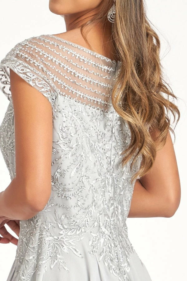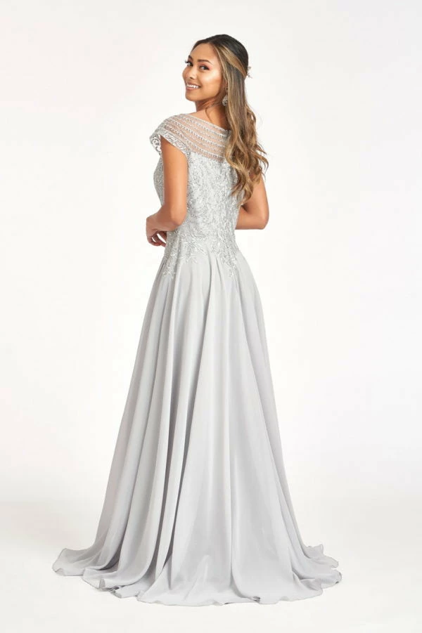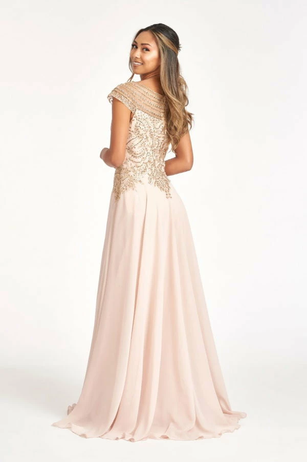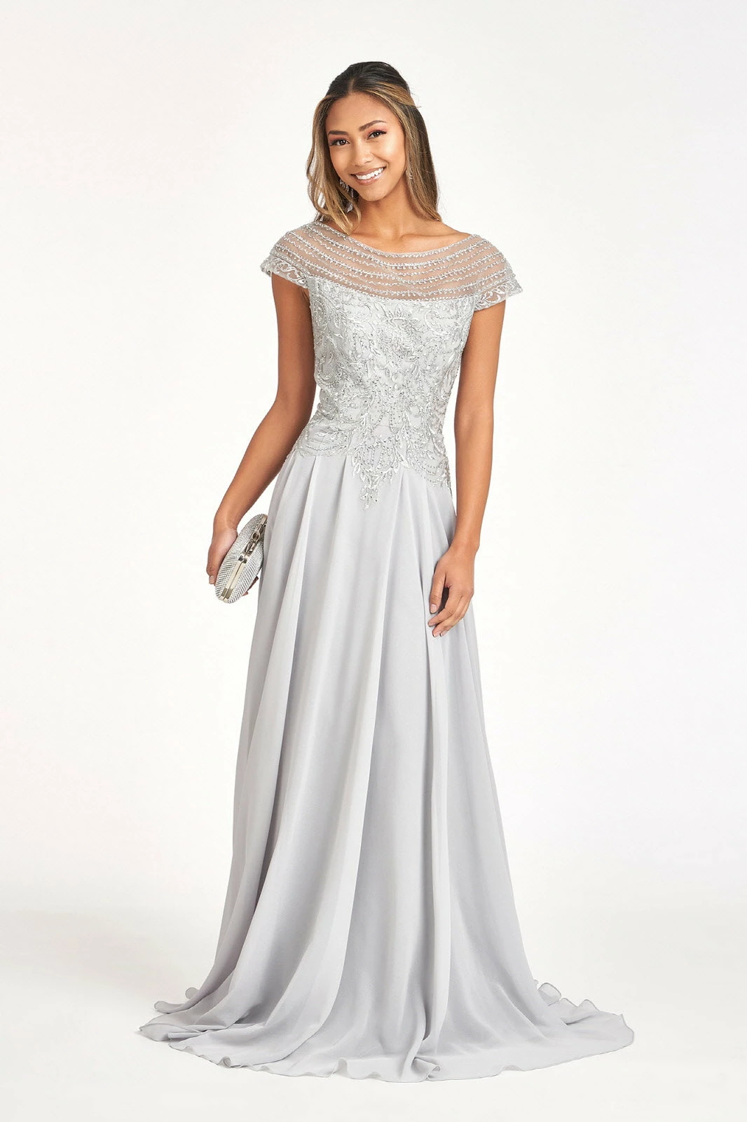 Make lasting memories in this long chiffon scoop-neck dress with A-line skirt Elizabeth K GL3065. Are you looking for a perfect dress for celebration? Opt for this elegant chiffon A-line dress! The bodice is decorated with sophisticated embroidery and beads, and sheer scoop-neck with cap sleeves is eye-catching.