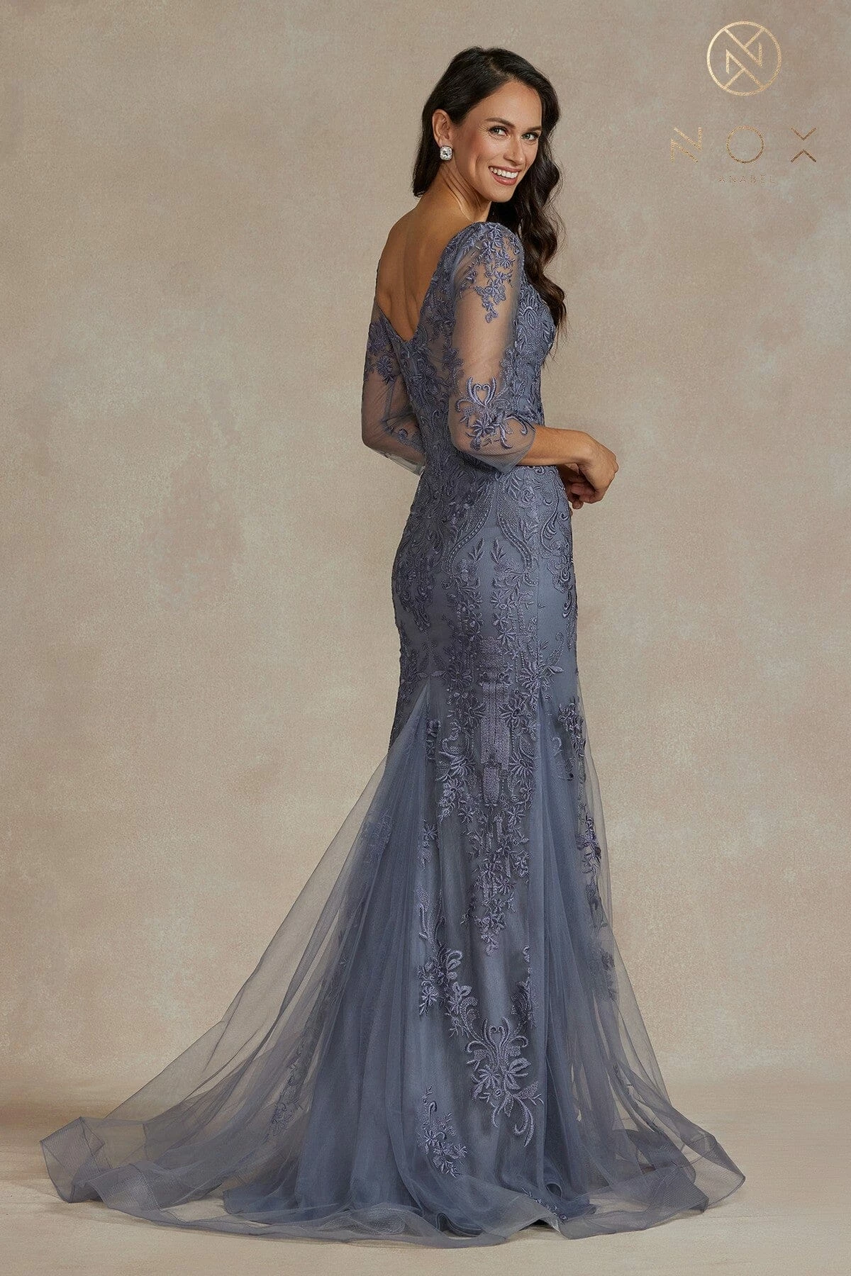 Captivate the room in this embroidered applique long mid-sleeve dress with fitted mermaid skirt by Nox Anabel JQ504.