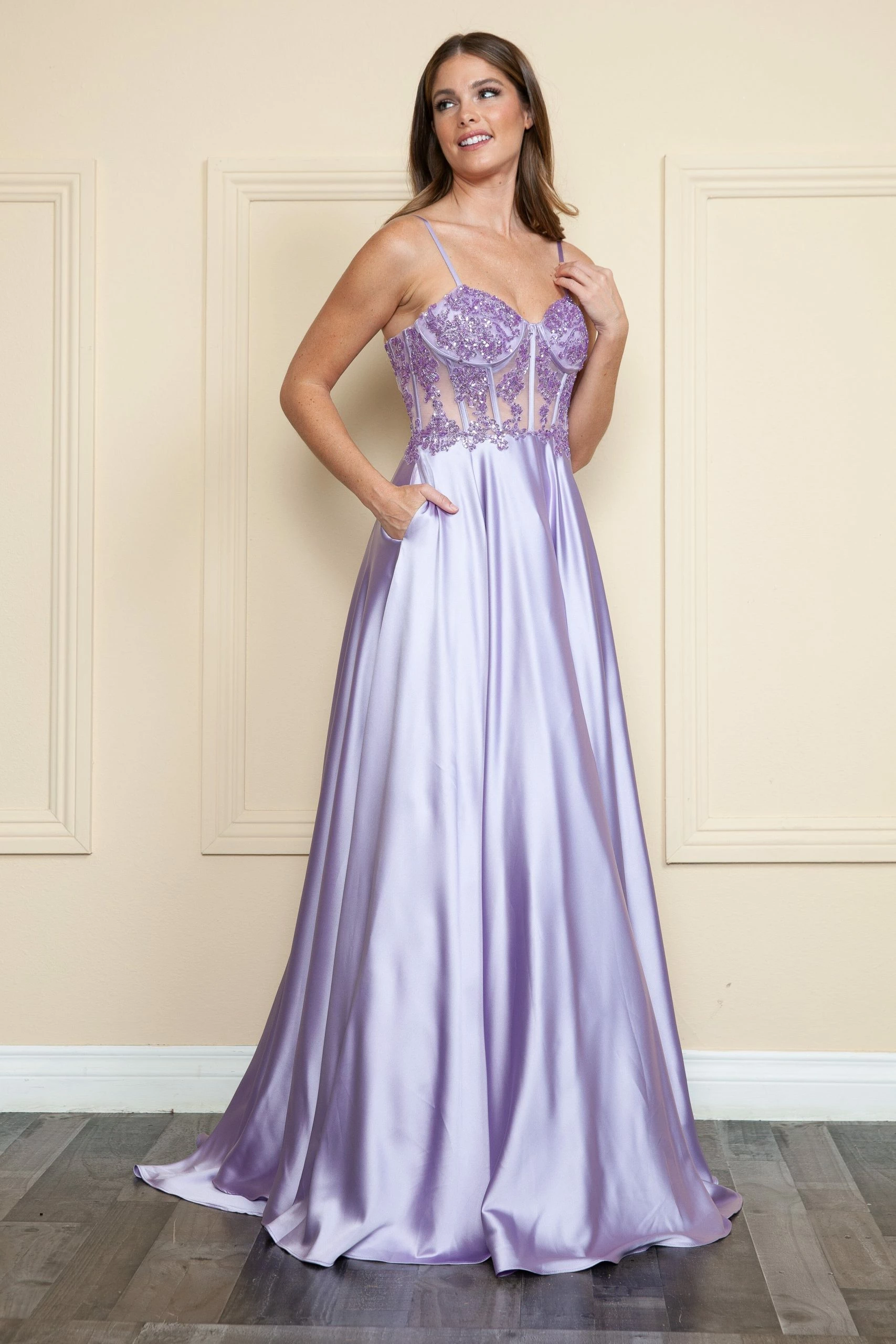 Turn heads in this bead embroidered long sleeveless satin dress with A-line skirt by Poly USA 9126. This beautiful gown features a sleeveless illusion sweetheart bodice with corset boning, open lace up back, and a floor length A-line skirt with a sweep train.
