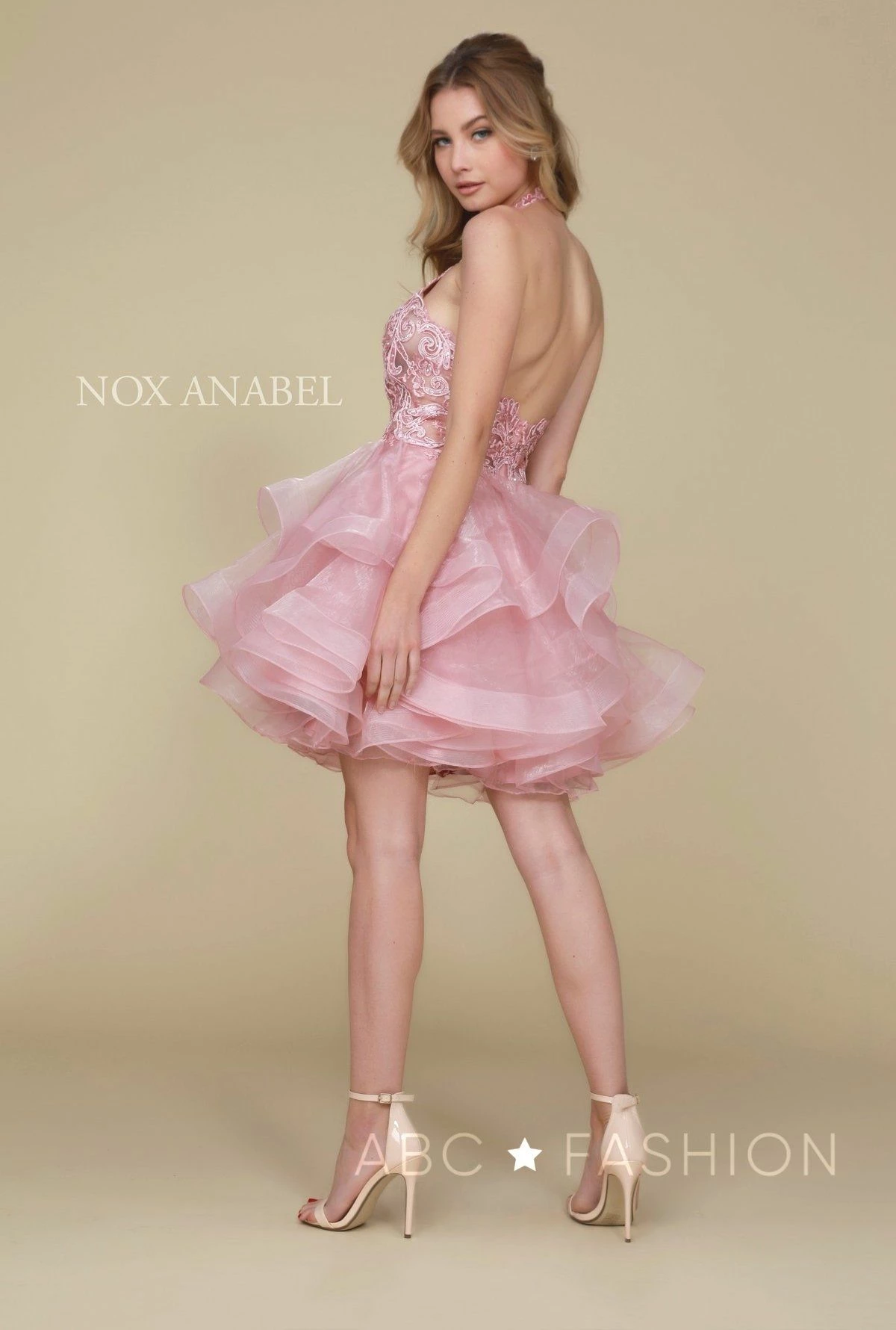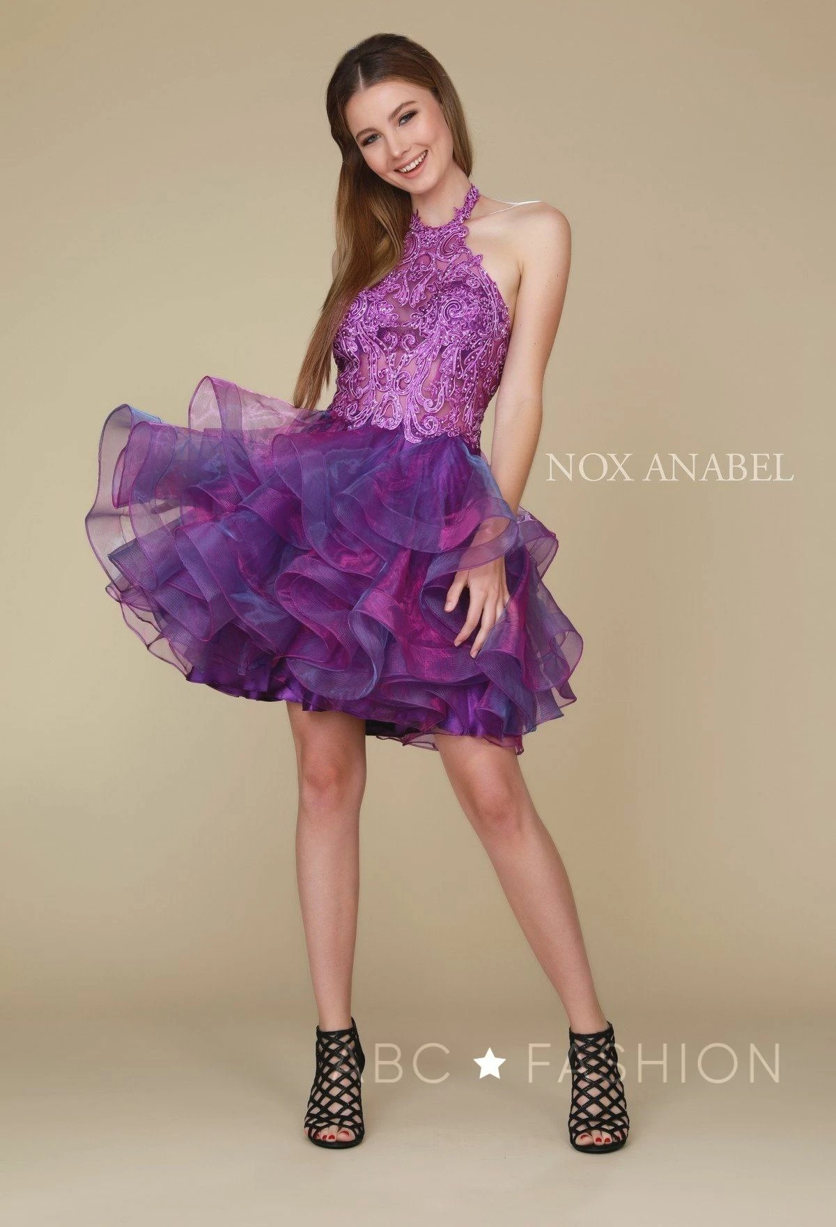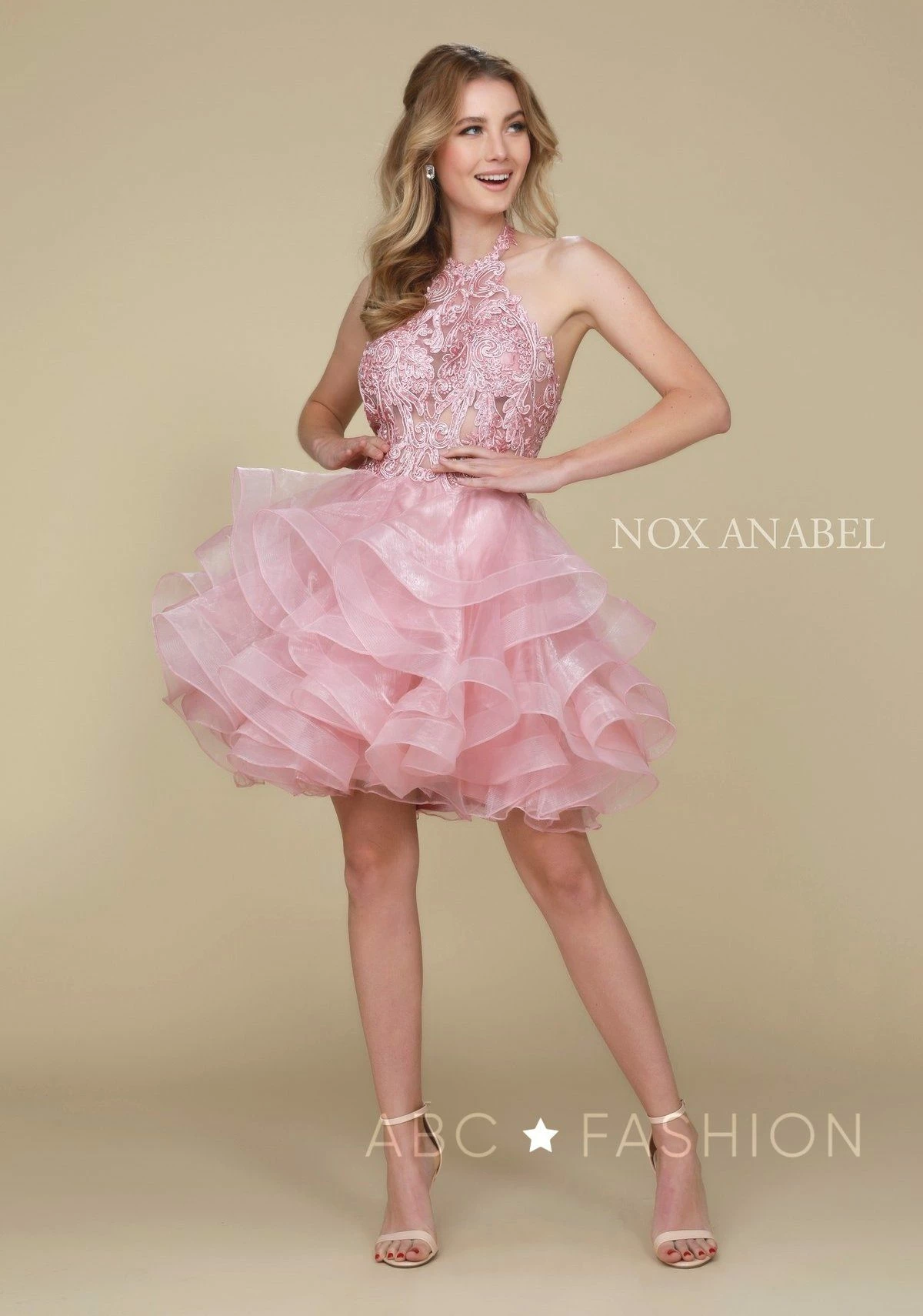 Receive lots of compliments in this embroidered bodice halter cocktail dress with tiered skirt by Nox Anabel A610. This short party dress features a high-neck halter bodice adorned with swirling floral embroidery, bra cups support the sheer illusion bodice, flirty open back, a short tiered organza skirt with horsehair hemline playfully flares out above the knees, and a zipper closure. Affordably priced under $200, this dress is perfect for any semi-formal event and will keep you on budget!