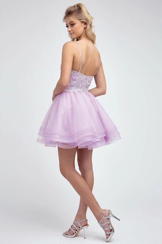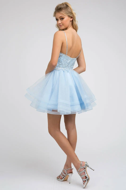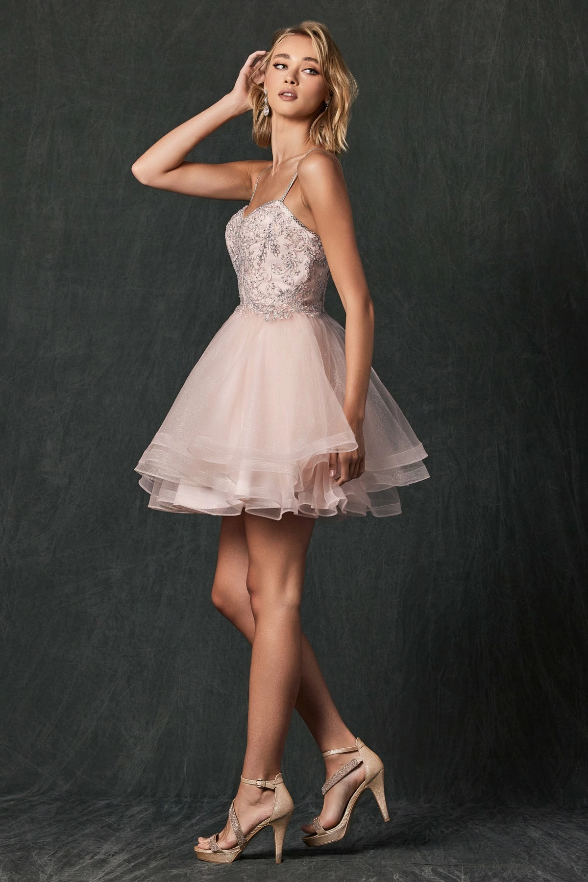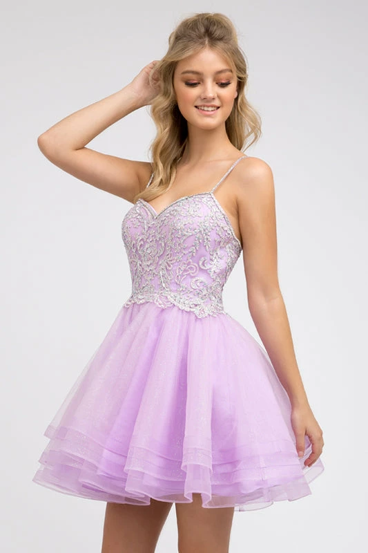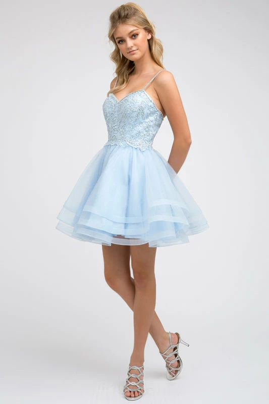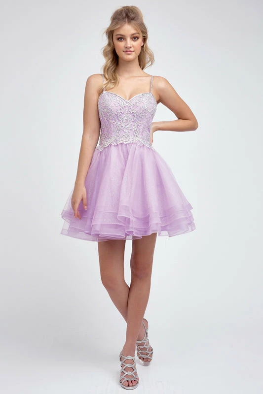 Look super cute in this embroidered short sleeveless sweetheart dress with layered A-line skirt by Juliet 849.