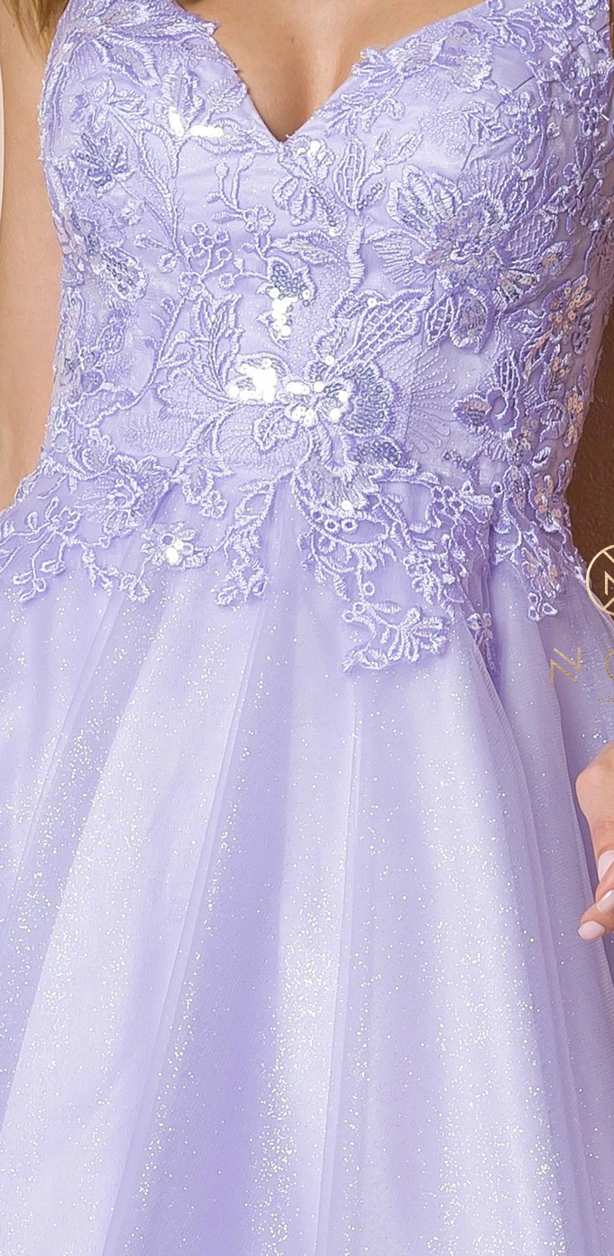 You’ll love twirling around in this embroidered short sleeveless V-neck dress with A-line skirt by Nox Anabel E777.