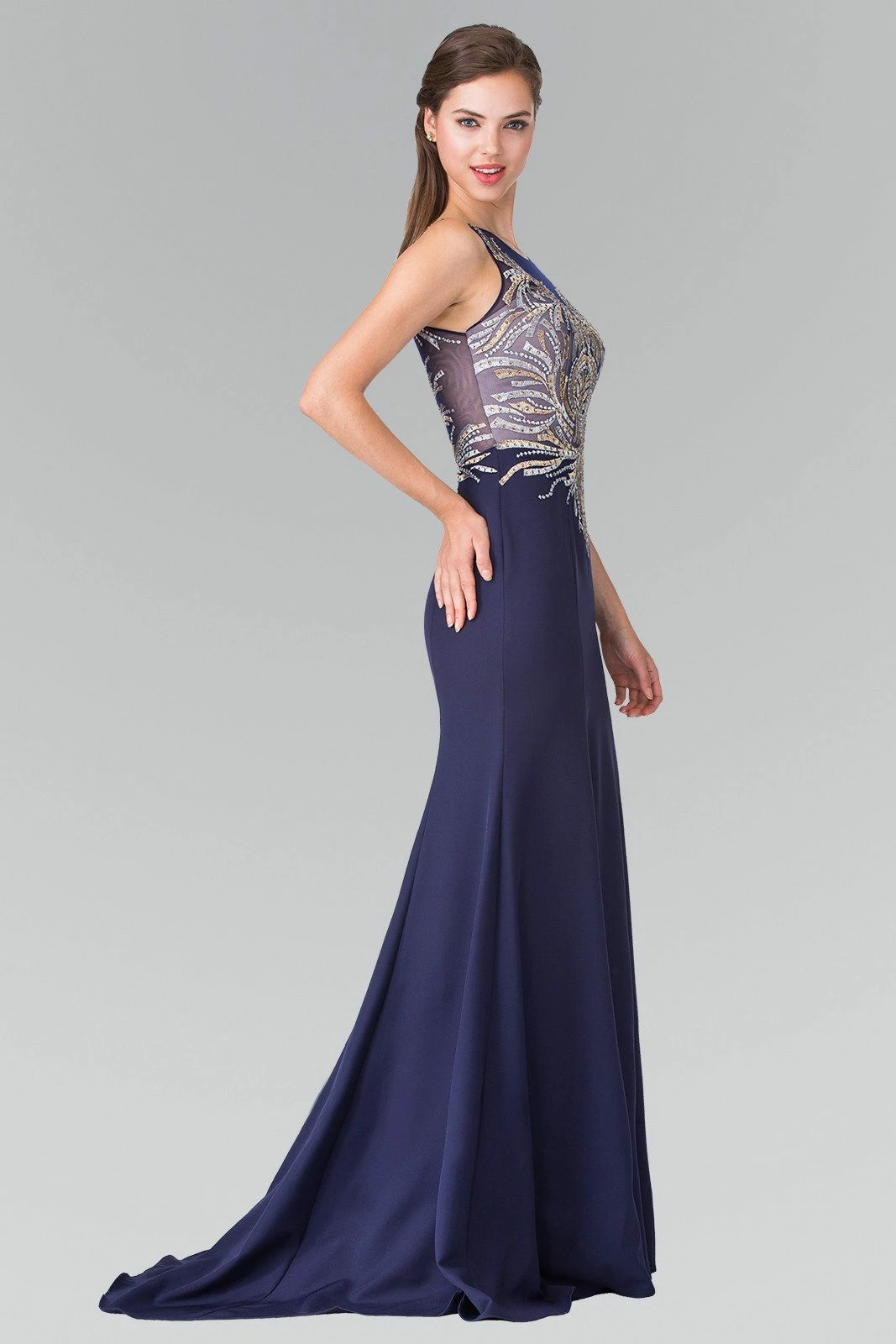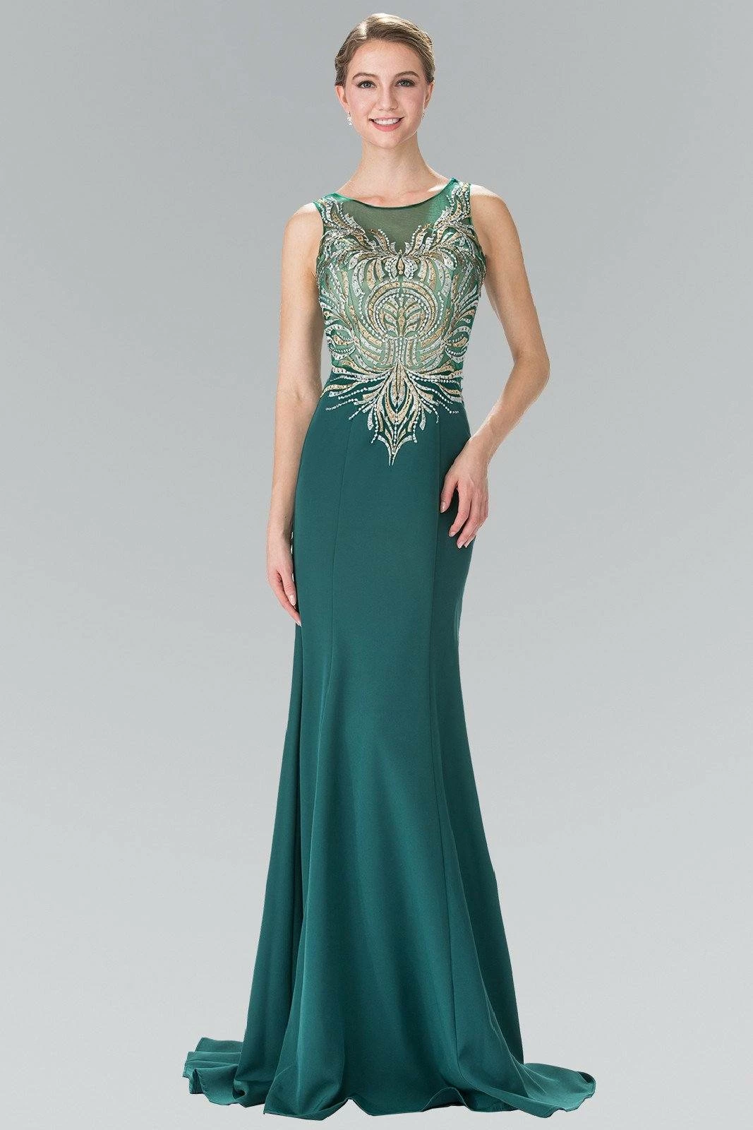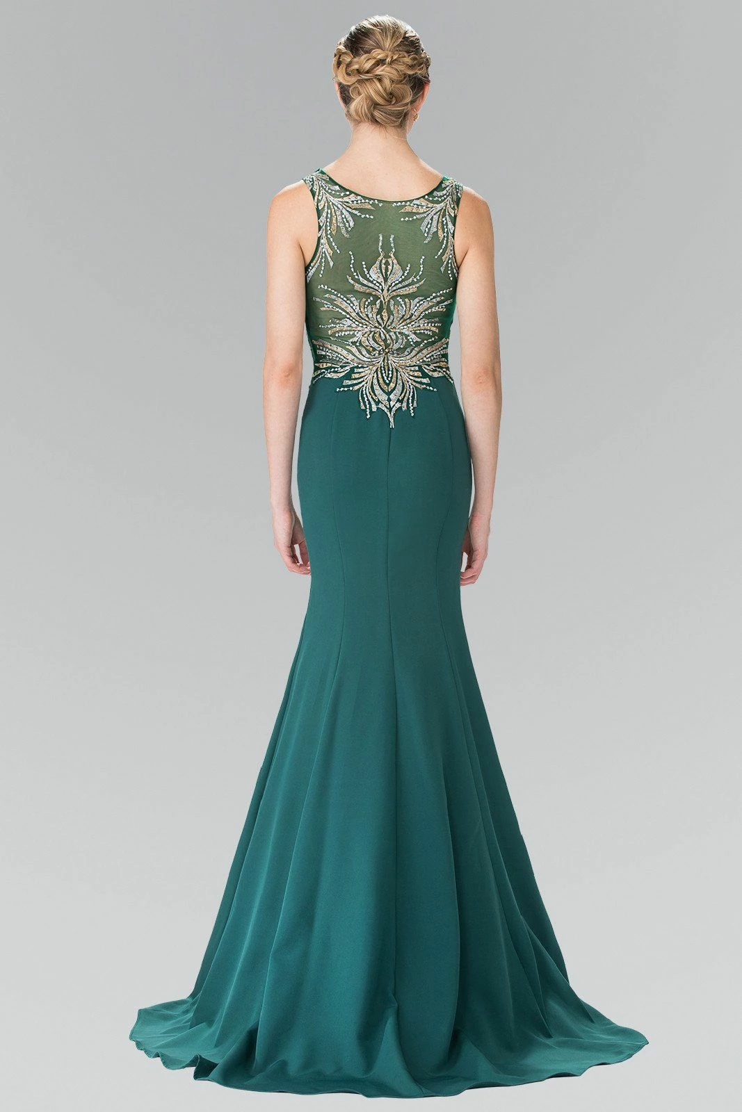 Be a trendsetter in this long bead embroidered sleeveless illusion dress by Elizabeth K.