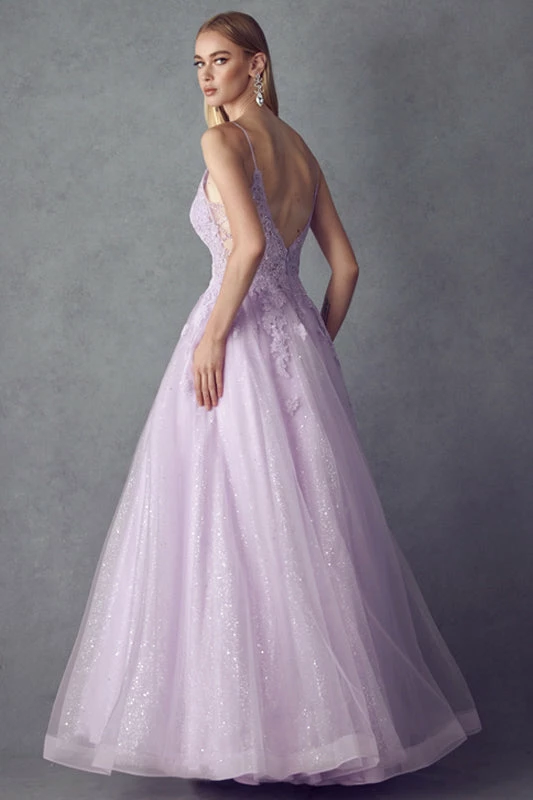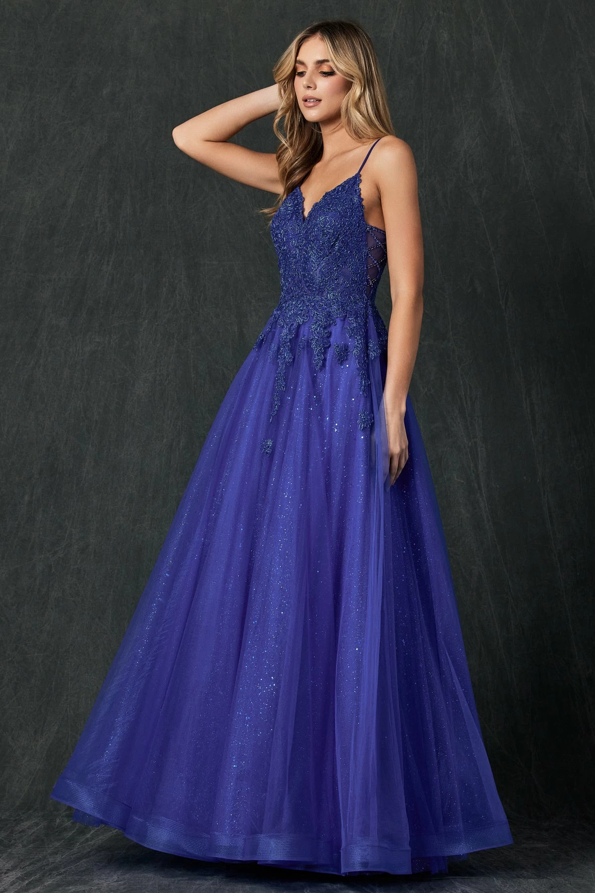Be the center of attention in this long open back sleeveless zip up dress with A-line skirt by Juliet 234. This dress is adorned with a v-neckline embroidered bodice and glitter tulle skirt to capture your audience.