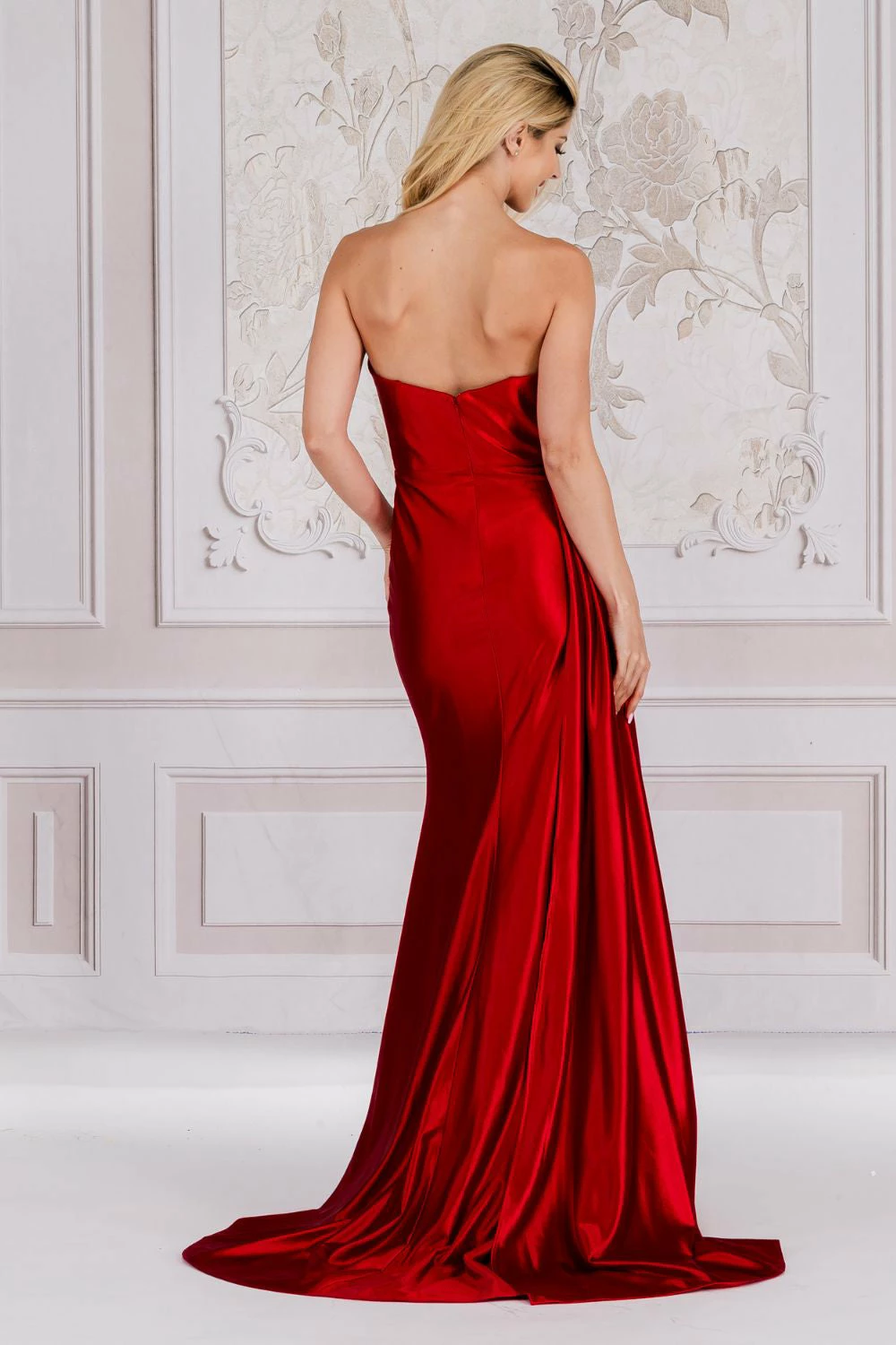Be the center of attention in this beaded long strapless ruched dress with fitted slit skirt by Amelia Couture BZ032. This glamorous strapless fit and flare shiny jersey gown features a sweetheart neckline, an elegant side sash attached at the waist, and an open back with a zipper closure. IMPORTANT NOTE: The tag for the Red dress will say Burgundy, but the actual dress will be Red like the pictures.