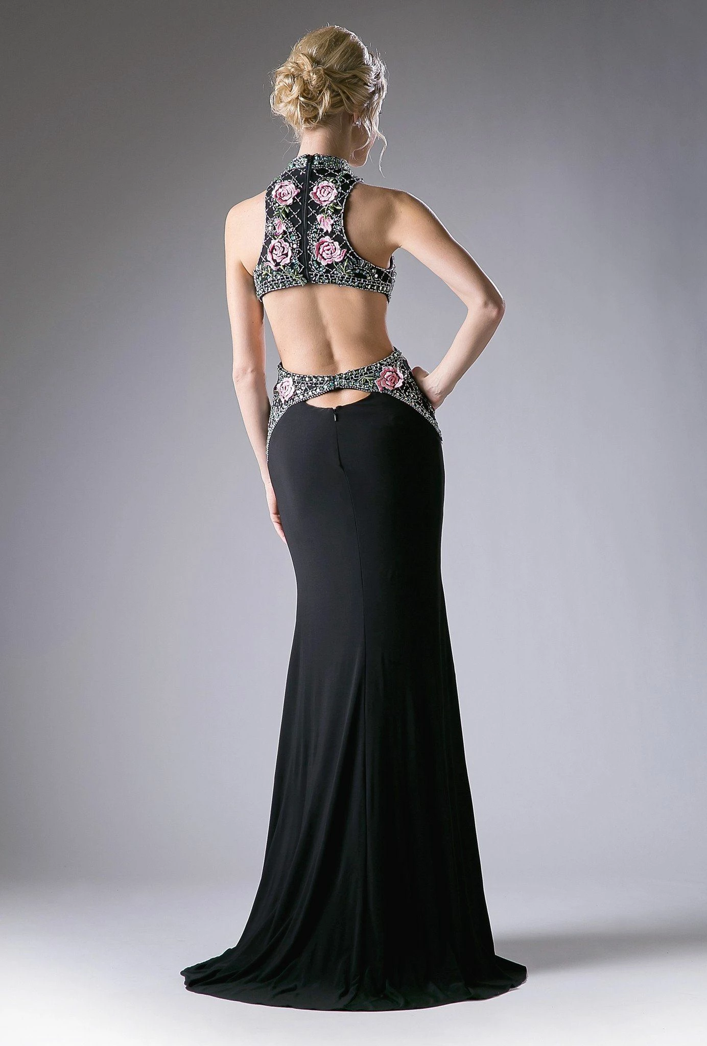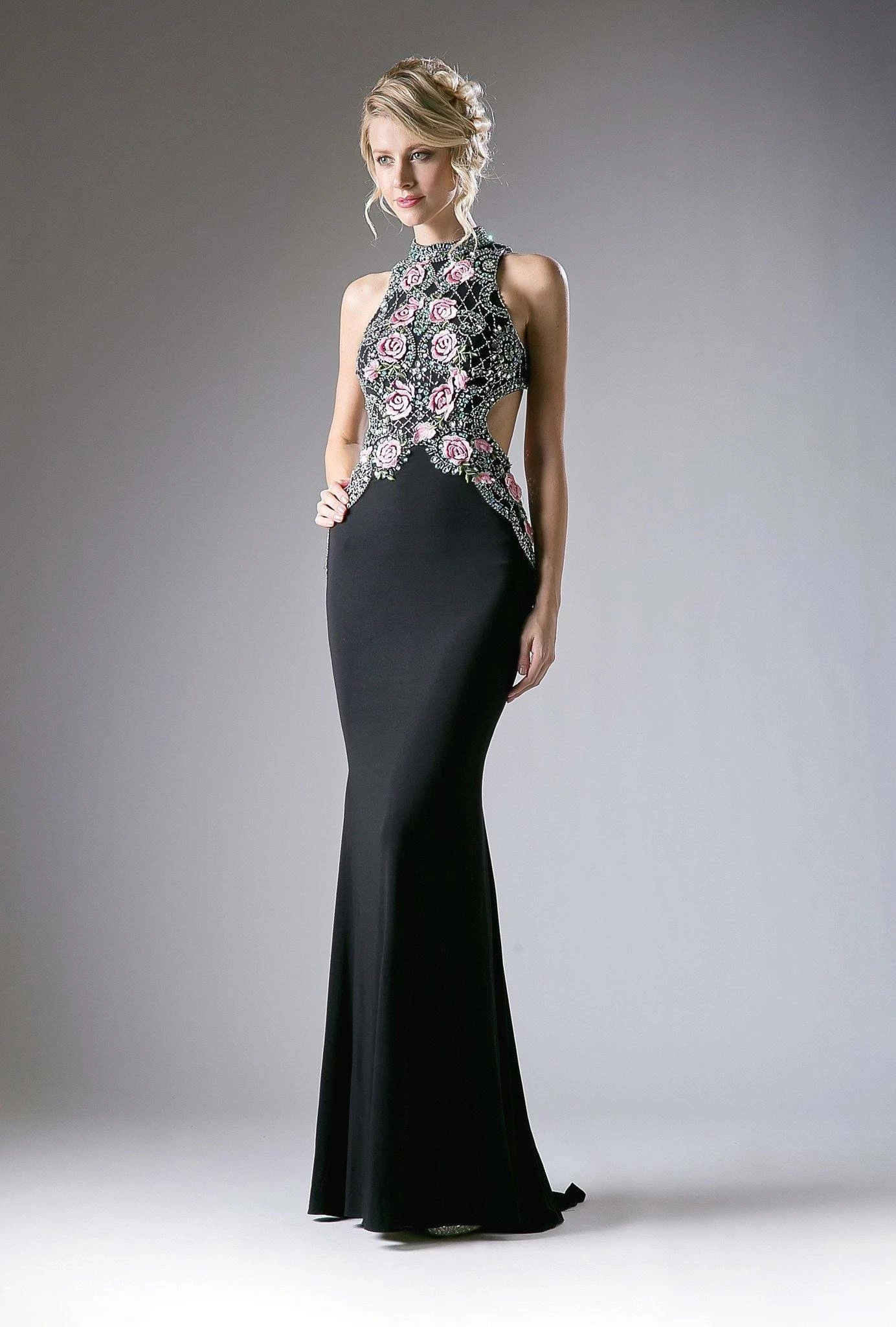 Look radiant in this long fitted black dress with floral embroidered bodice by Cinderella Divine KC1799.