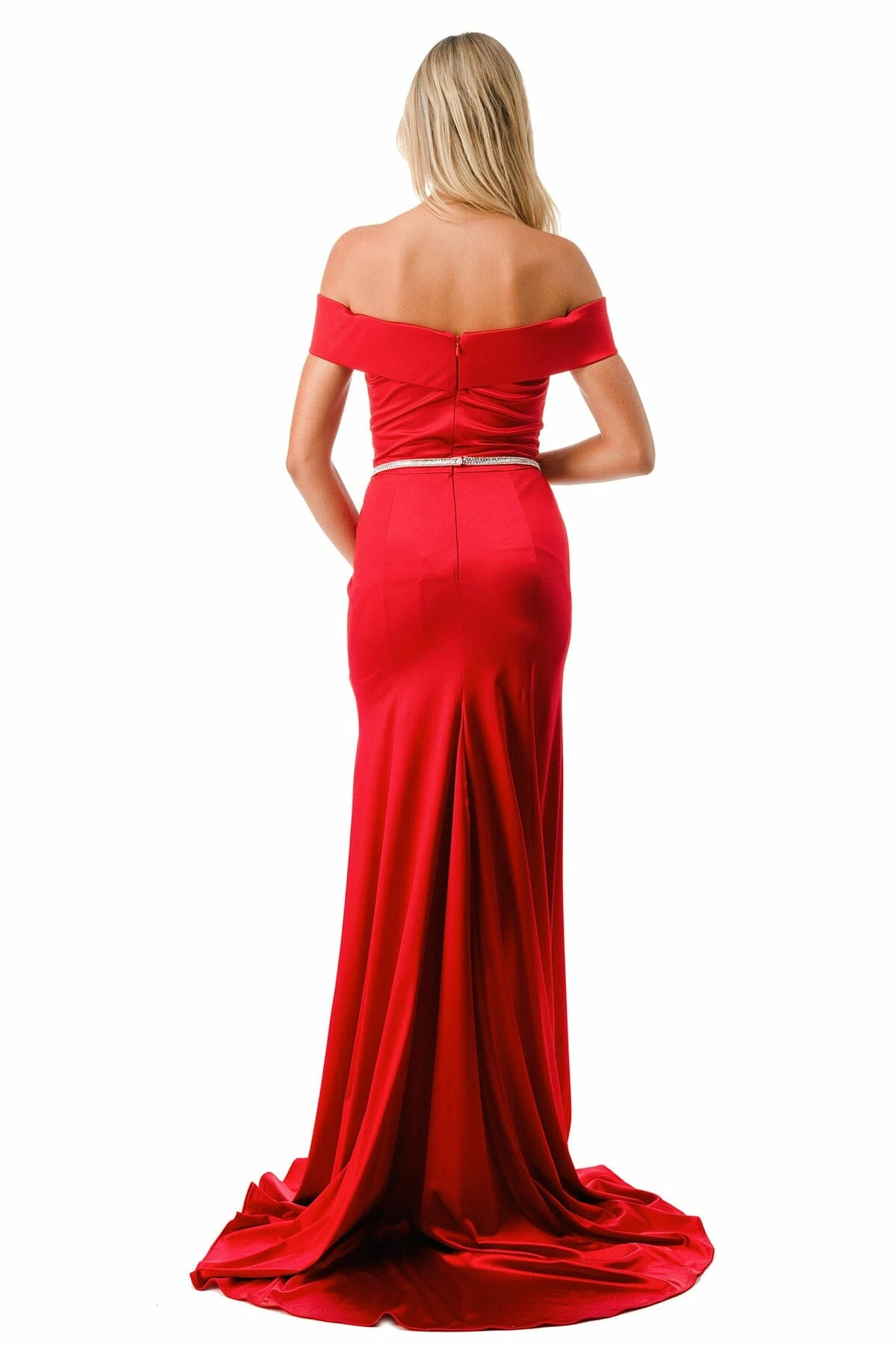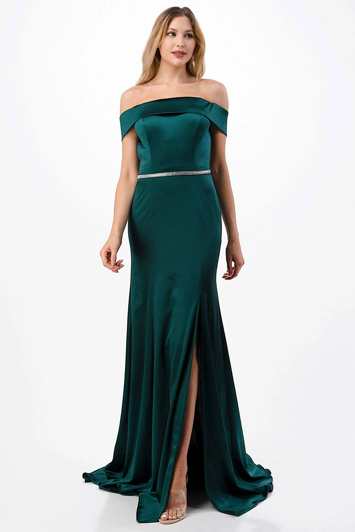 - Fitted Long Off Shoulder Satin Slit Dress by Coya D548