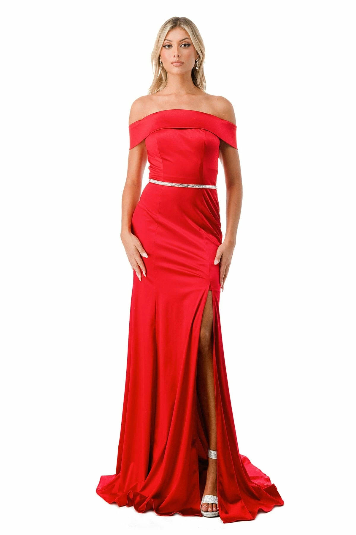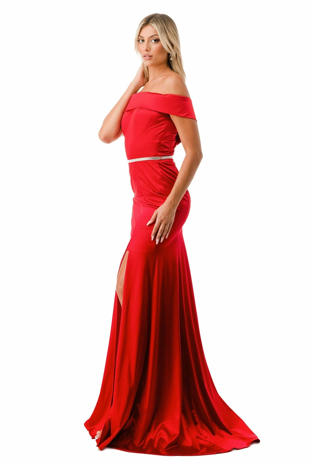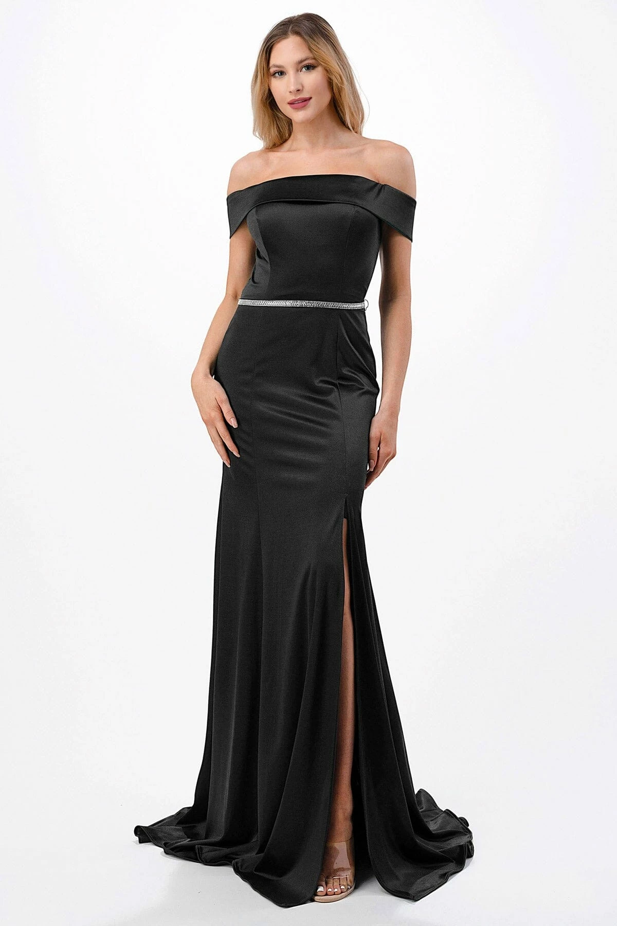 Make lasting memories in this long off the shoulder satin dress with fitted slit skirt from Coya Collection by Aspeed Design D548.