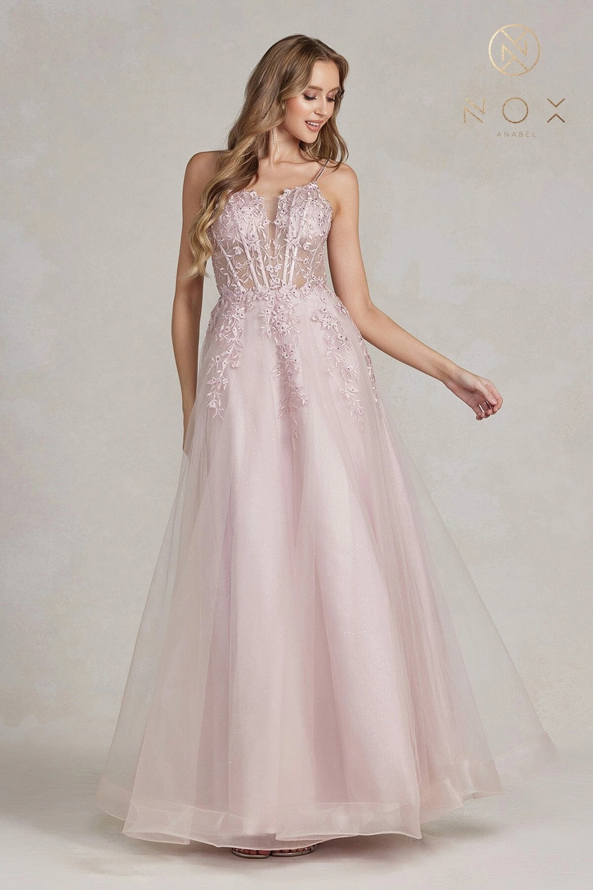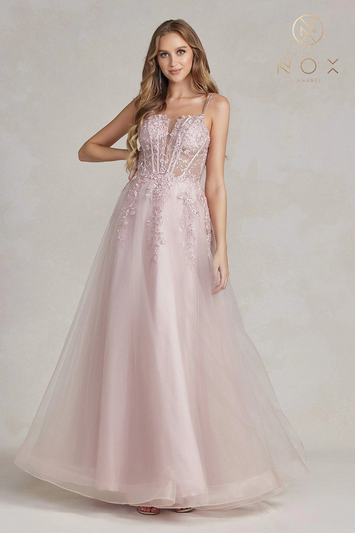 - Floral Applique Tulle Gown by Nox Anabel T449