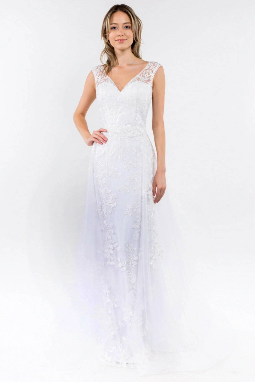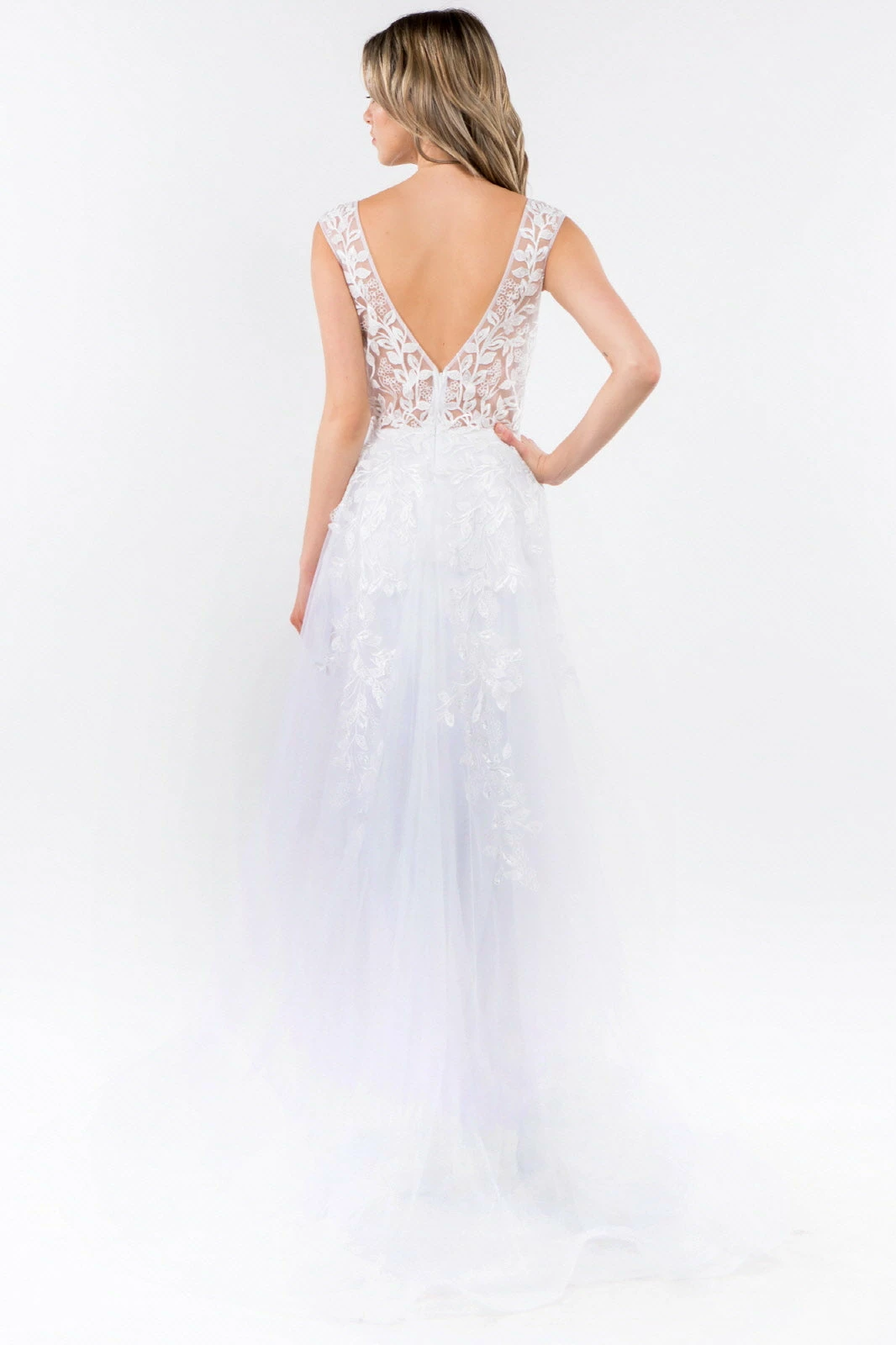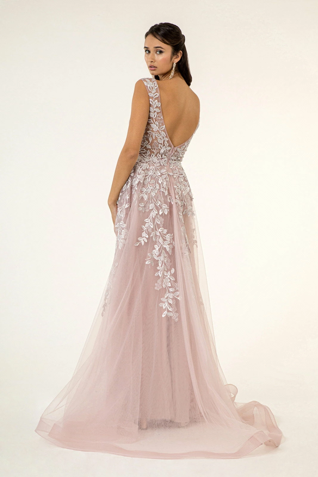 Remember the night in this long embroidered V-neck dress with fitted skirt Elizabeth K GL1920. Drop dead gorgeous embroidery and sparkly jewel embellished A-line dress! It also features 3-D floral appliques and airy mesh layer attached to waist to floor.