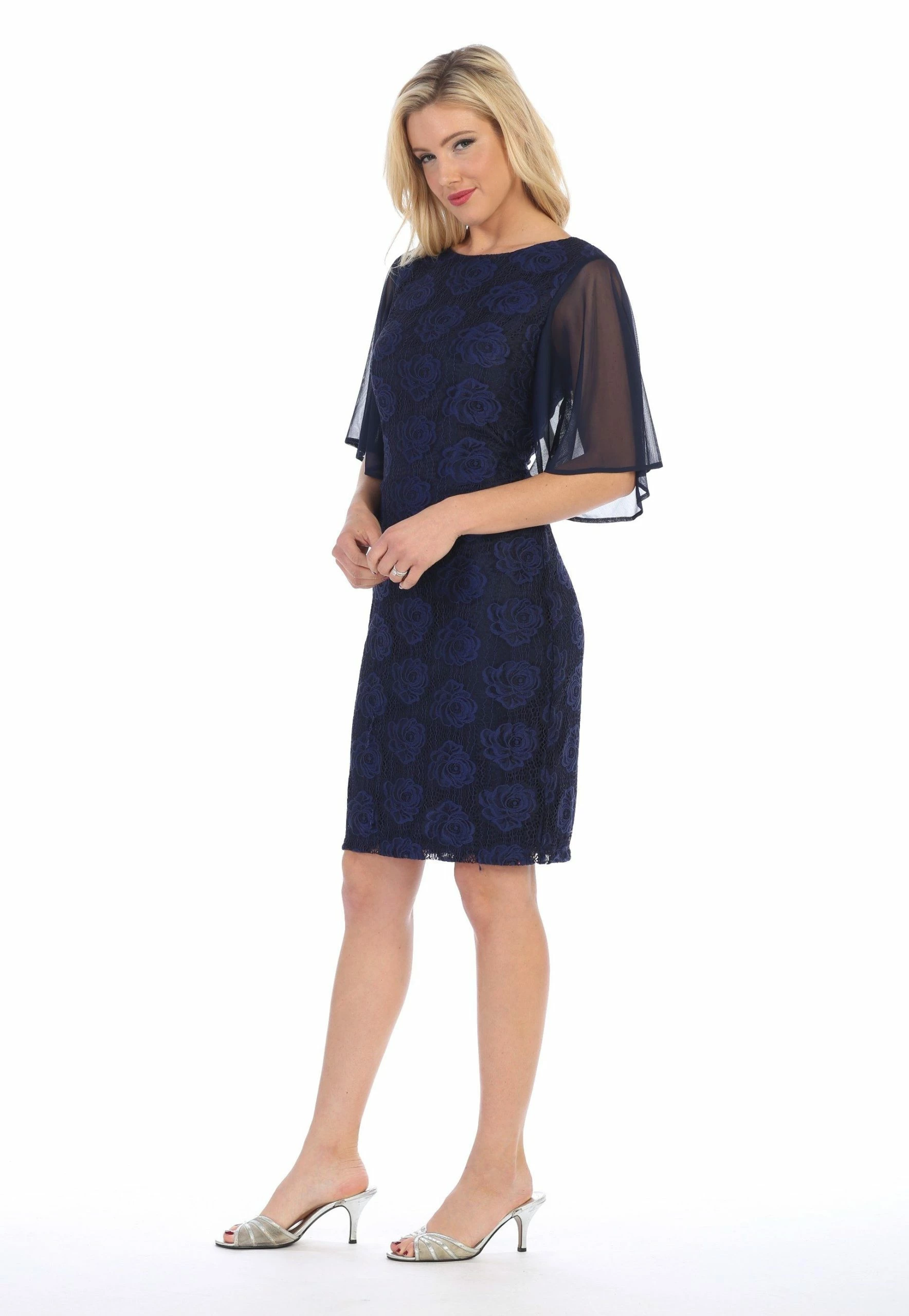 Turn heads in this floral embroidered cocktail dress with sheer flutter sleeves by Celavie 6289. This beautiful knee length dress features a scoop neck bodice embroidered with rose floral appliques, sheer flutter sleeves, short A-line skirt that falls at the knees, and a zipper closure. Affordably priced at $90, this short party dress is perfect for any formal event and will keep you on budget!