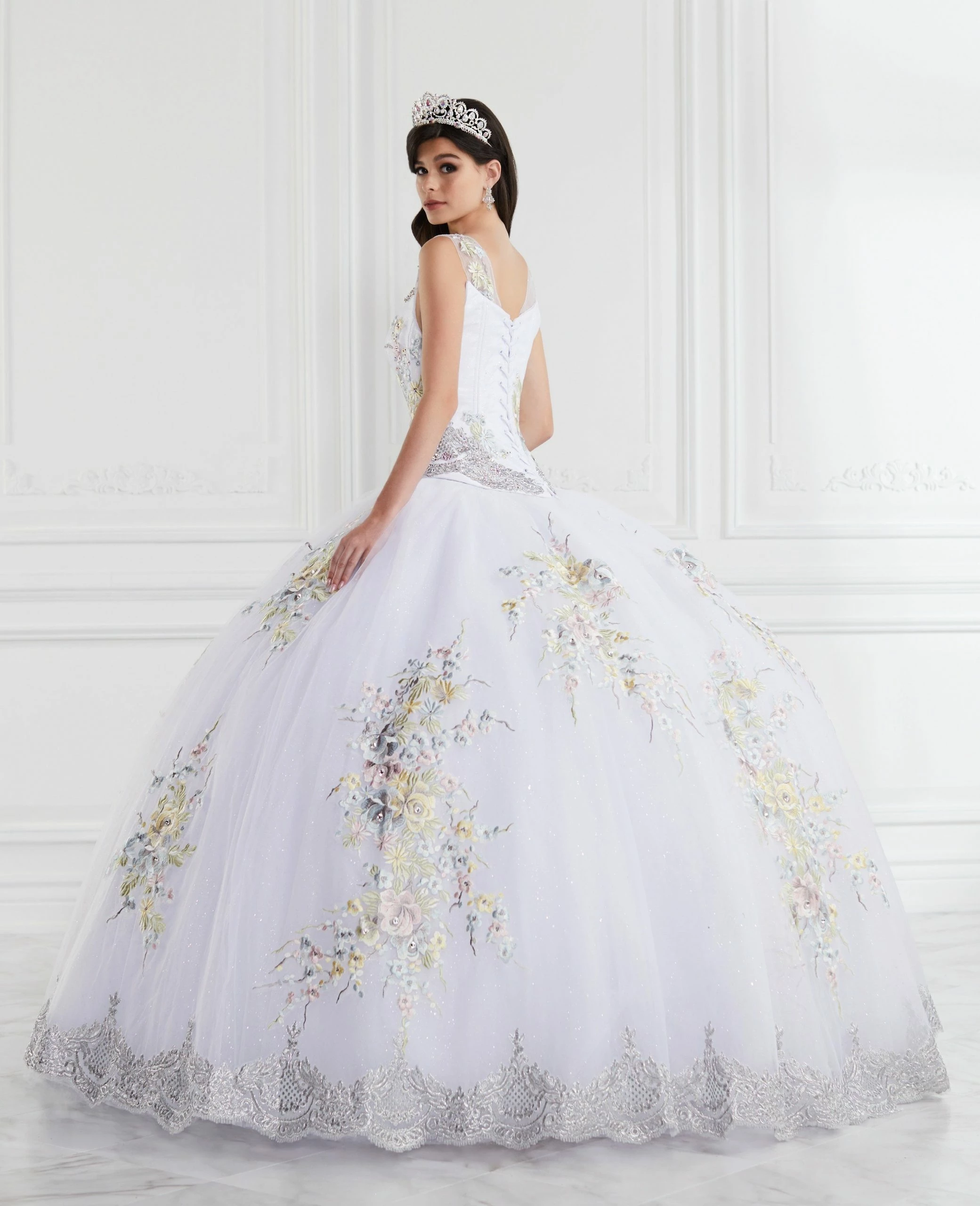 Make a grand entrance in this floral embroidered ball gown with removable by House of Wu LA Glitter 24067. Multi color floral lace applique decorates this glitter tulle long-line corset bodice which features detachable embellished shoulder straps, lace up back detail, and lace hem glitter tulle skirt.