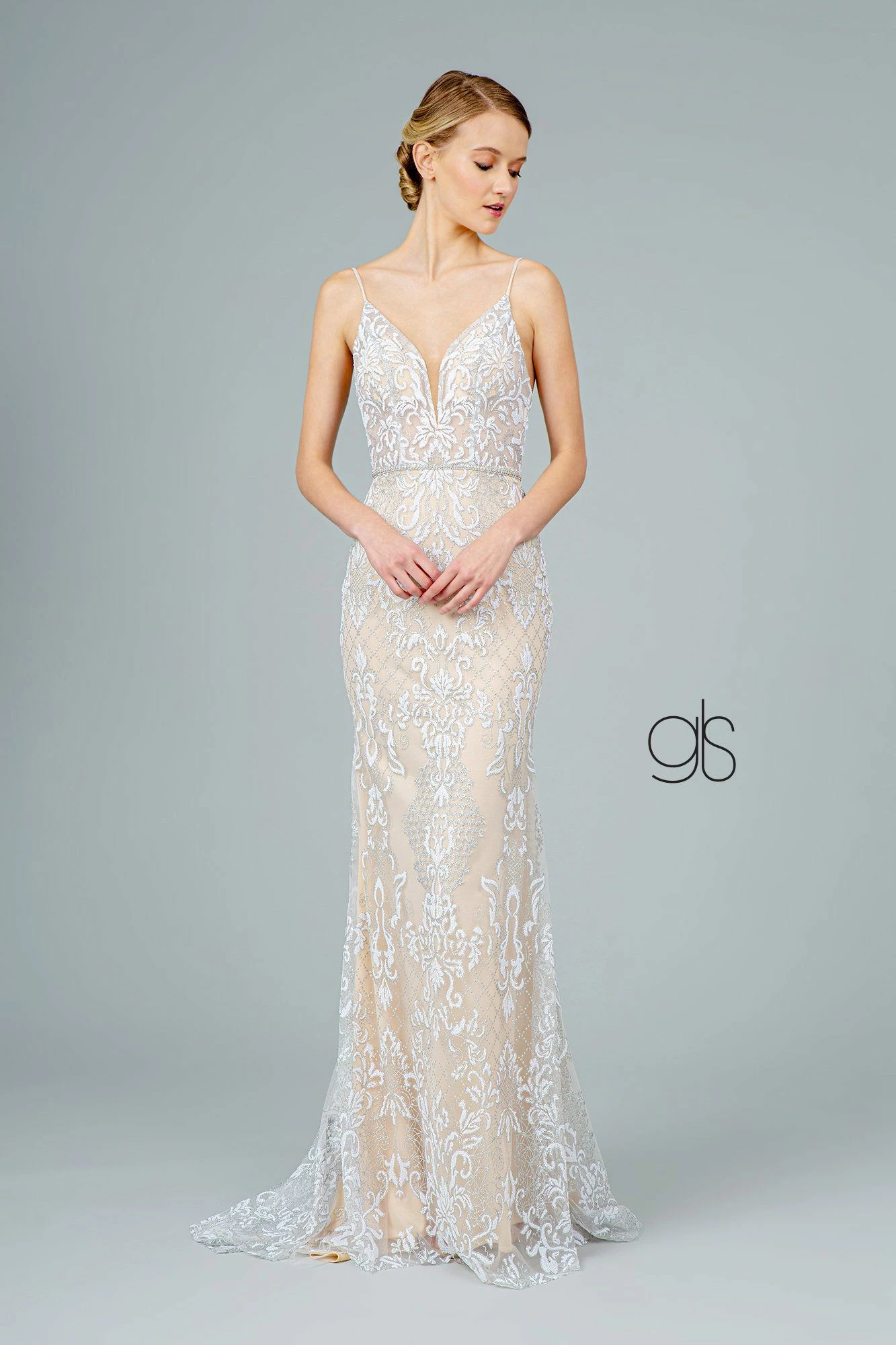 Be selfie ready in this glitter print long sleeveless V-neck dress with fitted skirt by Elizabeth K GL2990. Affordably priced at $199, this gown is perfect for any formal event and will keep you on budget!