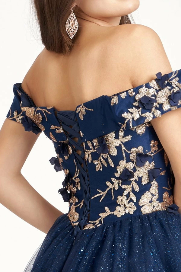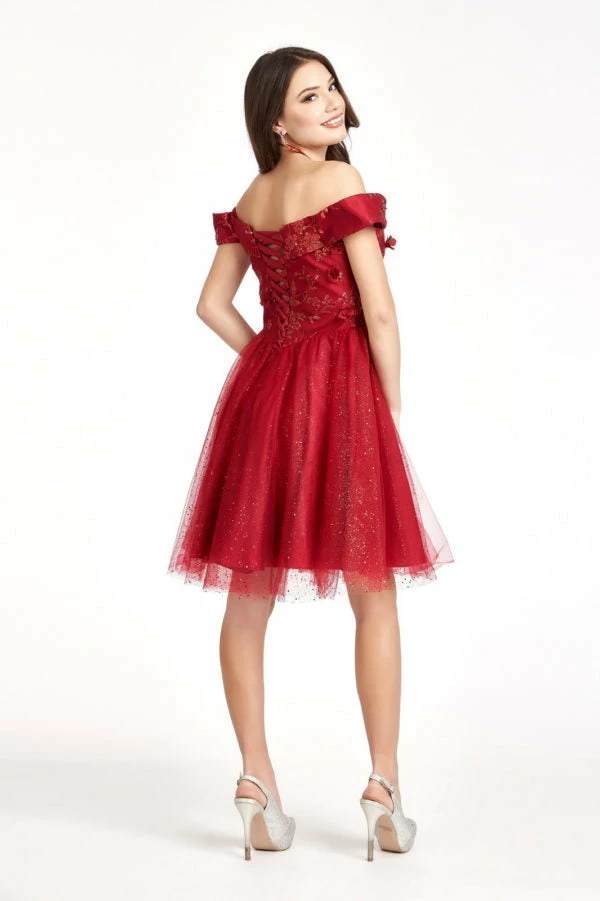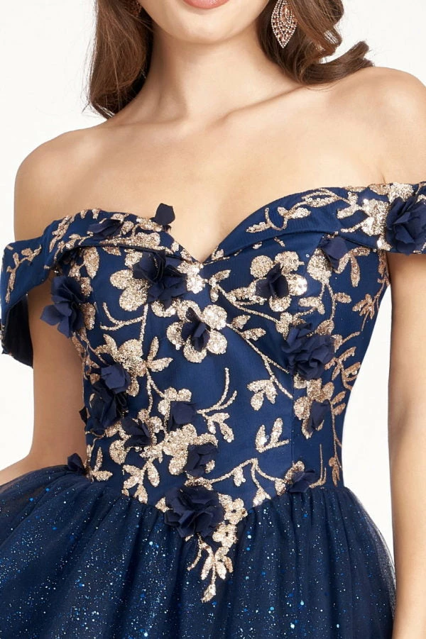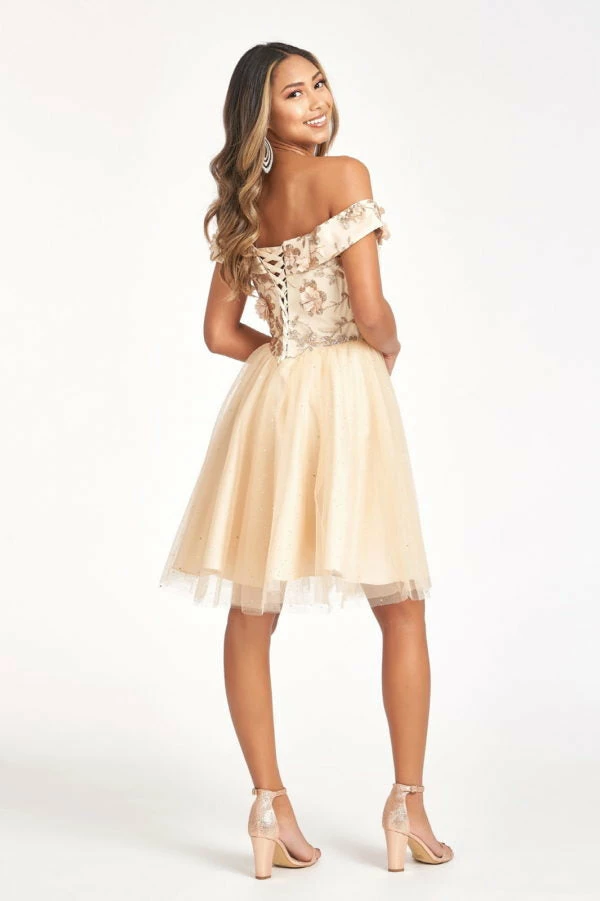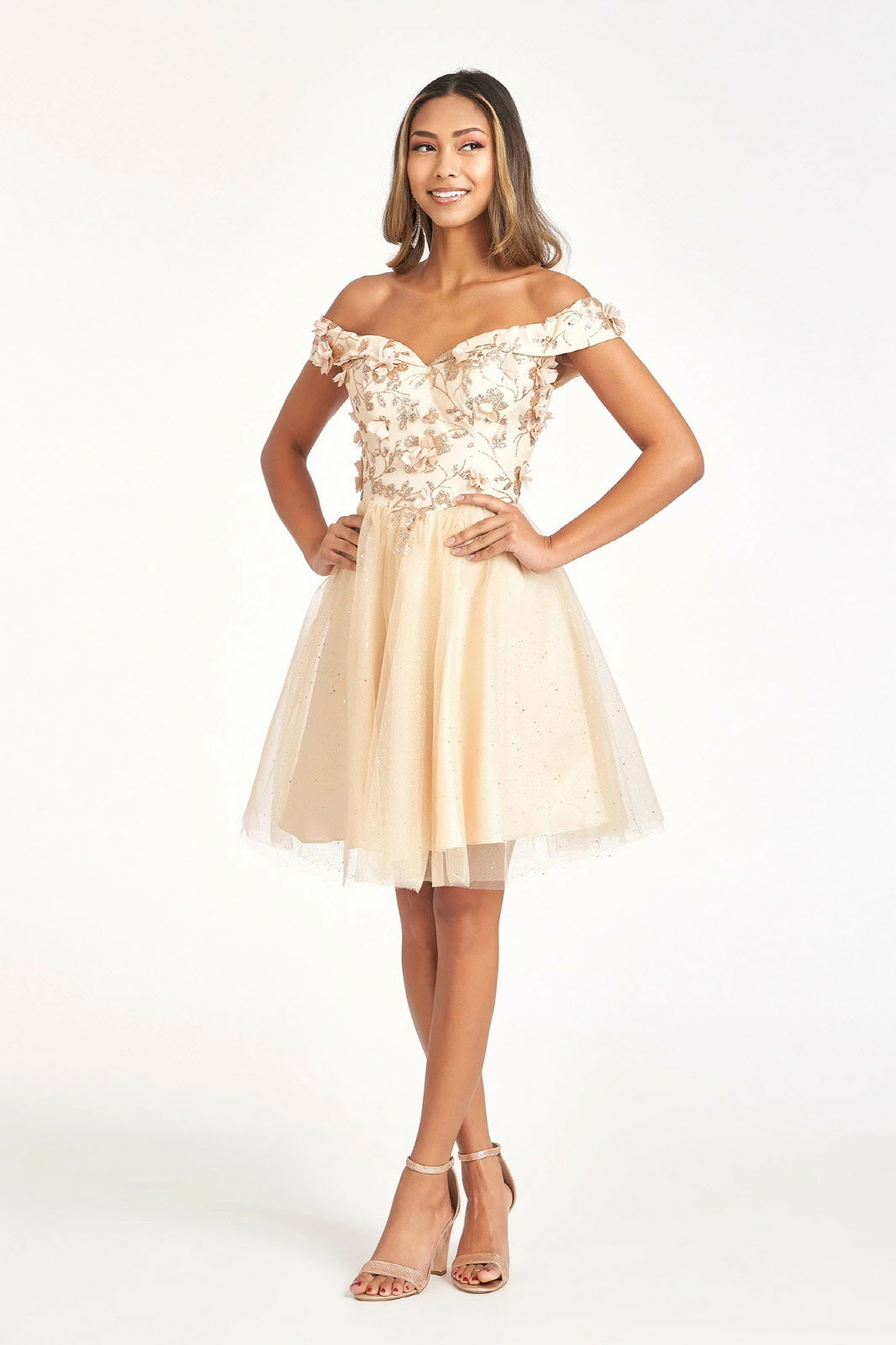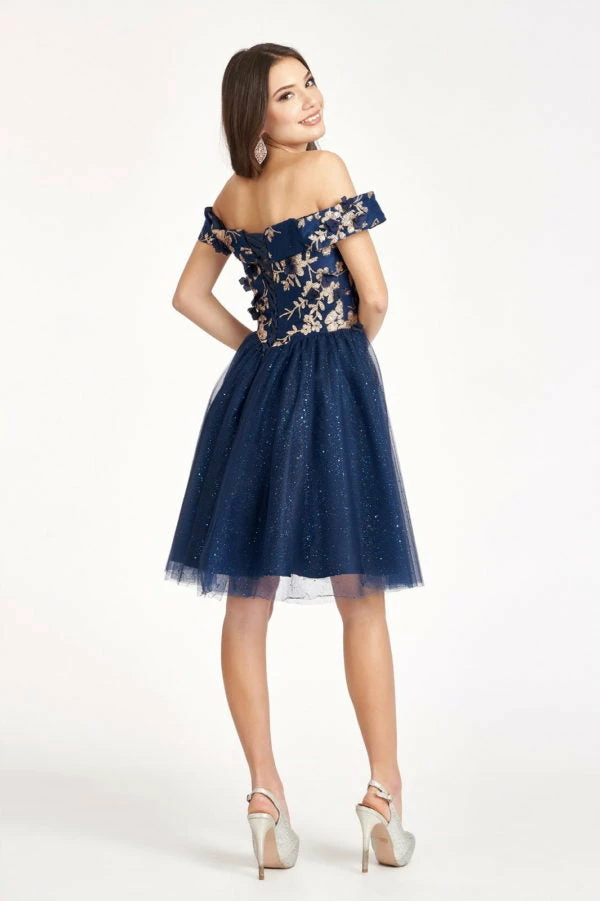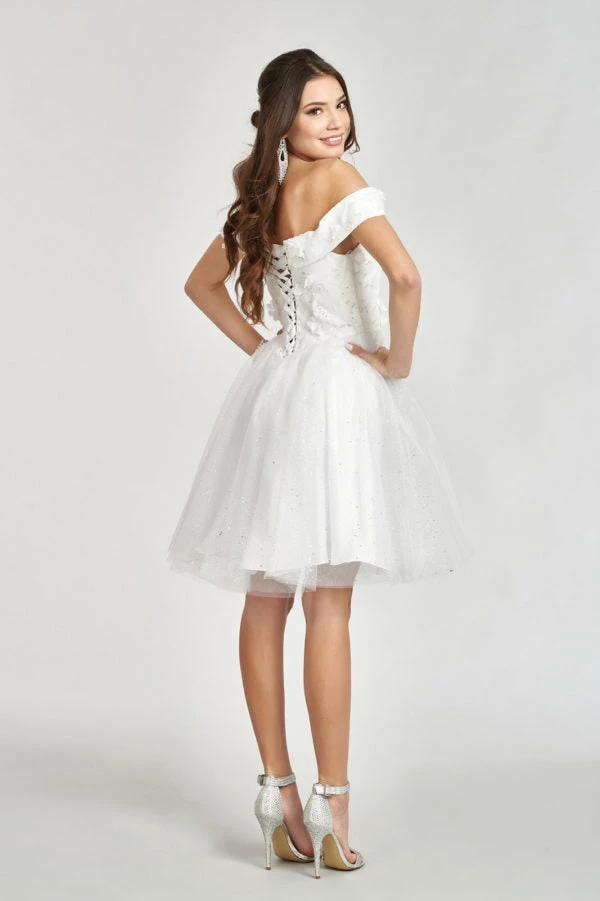 Be selfie ready in this glitter print short sweetheart dress with A-line skirt by Elizabeth K GS1978. Baby doll silhouette with off shoulder is impeccable! This mesh short dress is decorated with sparkly glitter in floral pattern and delicate flower appliques to create a 3D effect.