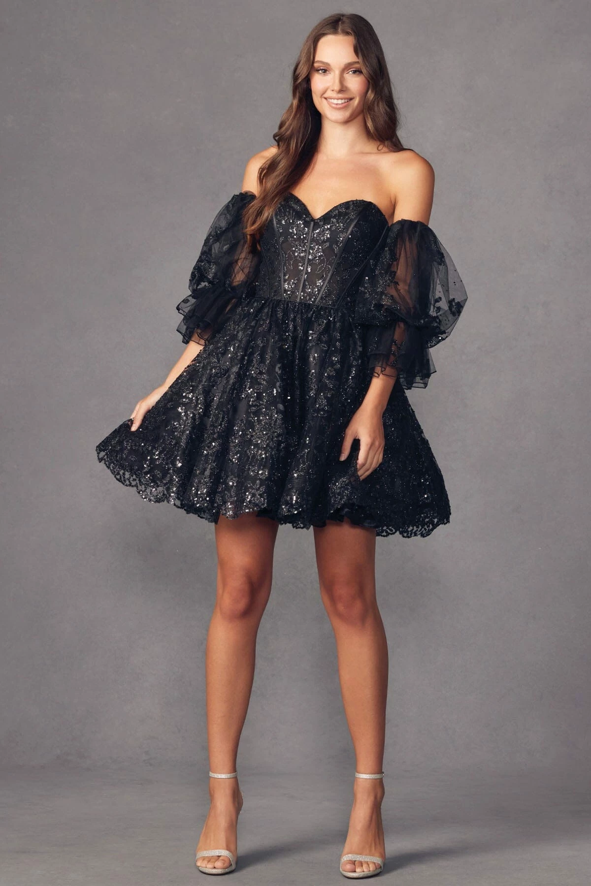 Look radiant in this glitter embroidered short strapless puff sleeve dress with A-line skirt by Juliet 895. The detachable puff sleeves are included – giving you a versatile look!
