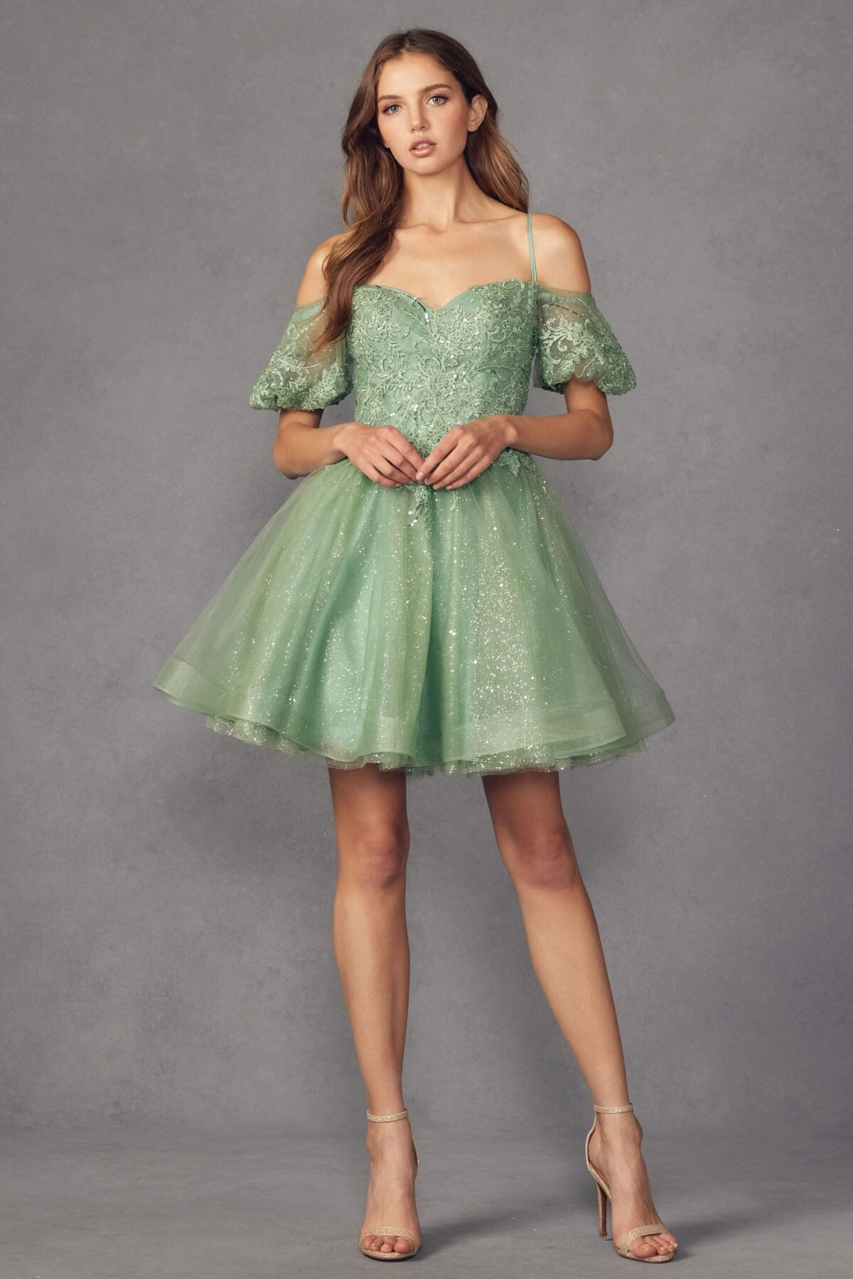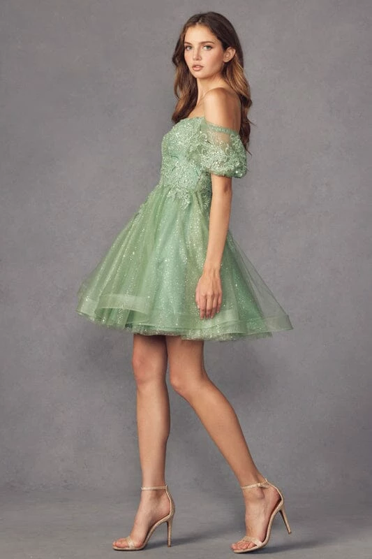 You’ll love twirling around in this embroidered lace applique short off shoulder short sleeve glitter dress with A-line skirt by Juliet 886. The detachable spaghetti straps are included – giving you a versatile look!