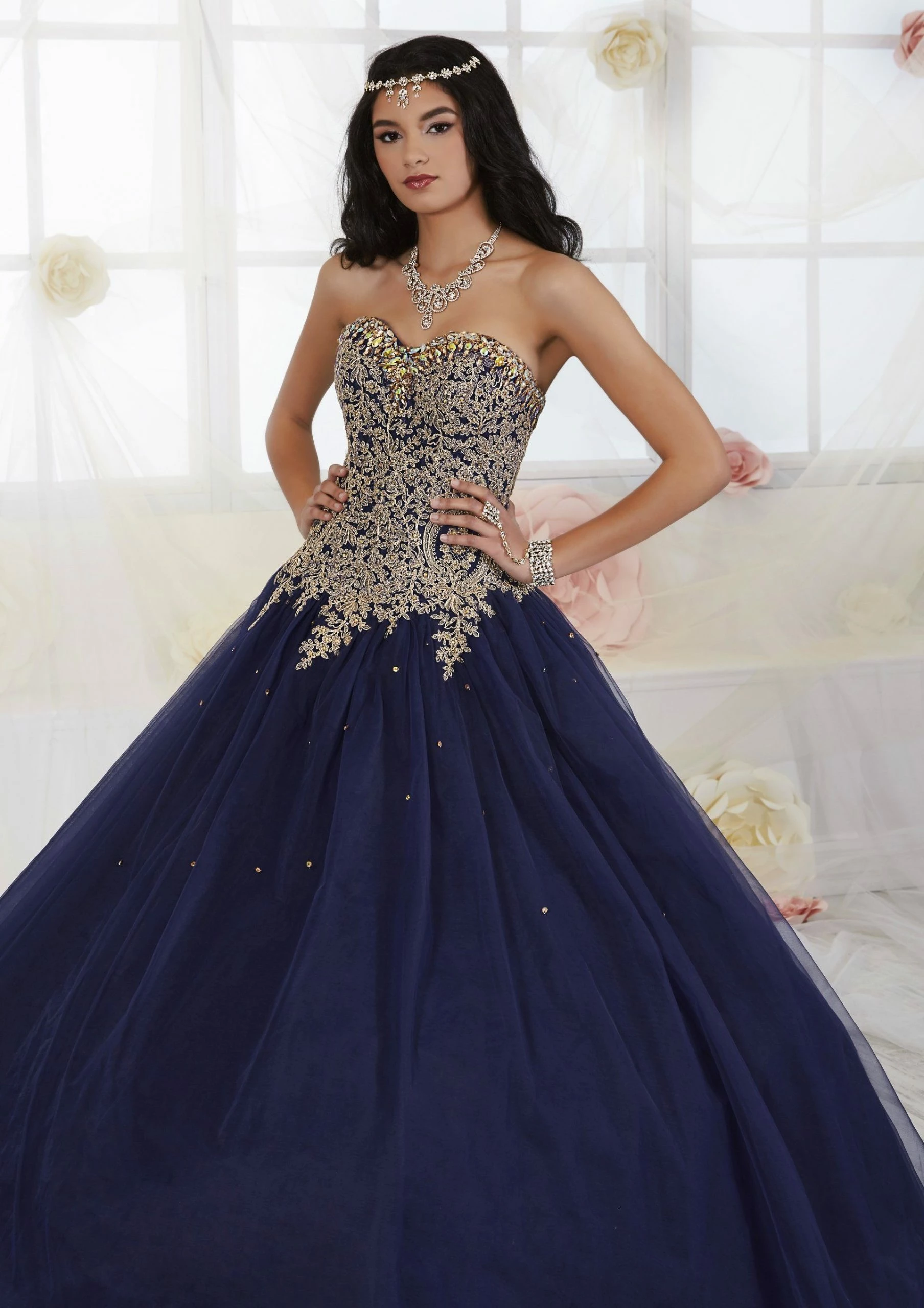 Look stunning in this gold appliqued long strapless sweetheart dress with A-line skirt by House of Wu Fiesta Gowns Collection 56286. A true eye-catching ballgown made with shining gold embroidery accented with stones – all completed with a beautiful sweetheart neckline and lace-up back.