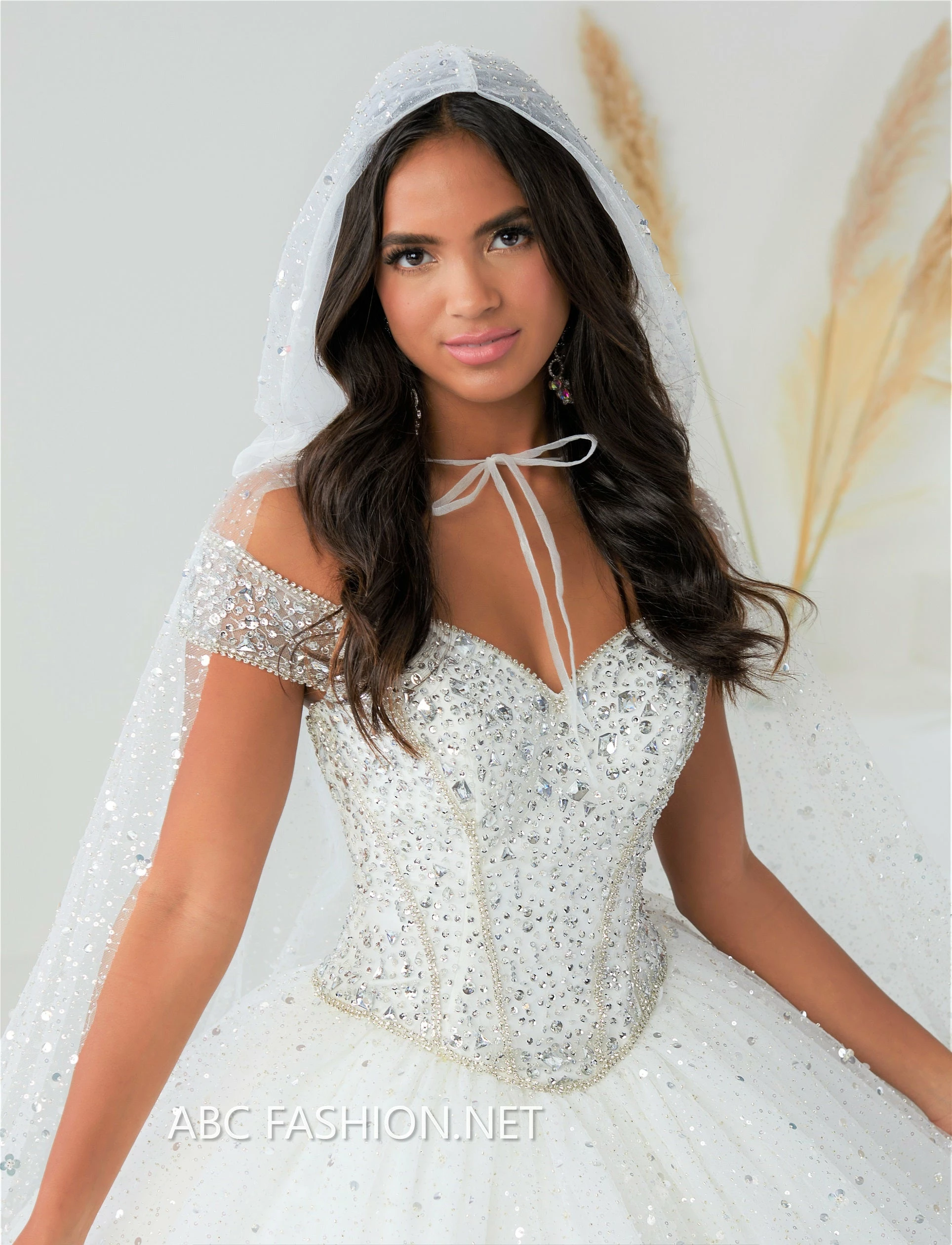 Have a magical moment in this off shoulder hooded cape dress with A-line glitter tulle by House of Wu Fiesta Gowns 56452C. Enjoy your princess moment in our off-the-shoulder ball gown featuring a handsewn beaded bodice and short sleeves. The full ball gown skirt is crafted from a gathered mesh and accented with 3D handsewn sequins and sweetheart neckline. Matching hooded cape included. Lace-up back and sweep train.