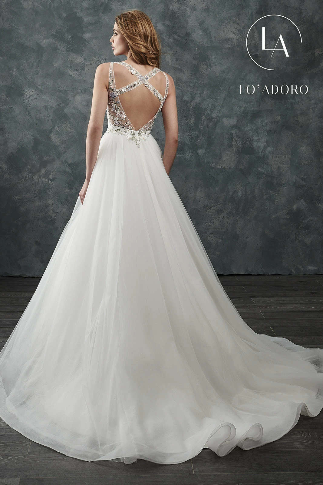 Feel like a princess in this long sleeveless wedding dress with A-line skirt by Mary’s Bridal Lo’ Adoro Collection M645. Modern and sophisticated, this full tulle ball gown can be your dream dress. Step into this next chapter with a subtle plunging neckline embellished with lace appliques and a fully beaded crisscross back.