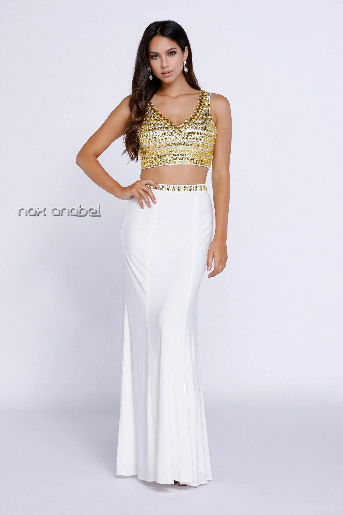 Rock this ivory sleeveless two-piece crop top gold beaded dress by Nox Anabel Style Number 8183 at your upcoming formal event. This long evening gown features a sleeveless tank crop-top adorned with sparkly gold beads, beaded waistline, beaded back, floor length skirt, and a zipper closure.