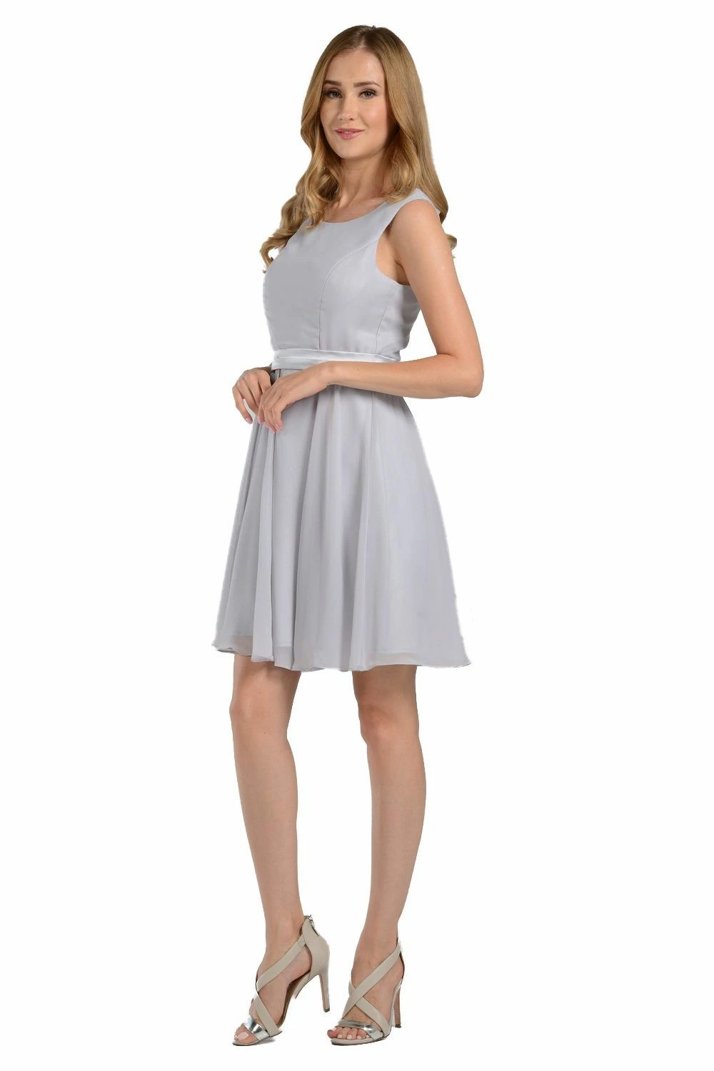 Look lovely in this short sleeveless ivory chiffon dress by Poly USA Style Number 7290. This sleeveless dress features a modest high neckline, satin waistband, short A-line skirt, and a back zipper closure. Affordably priced under $100, this versatile short party dress is perfect for bridesmaids, cocktail parties, and for homecoming dances!
