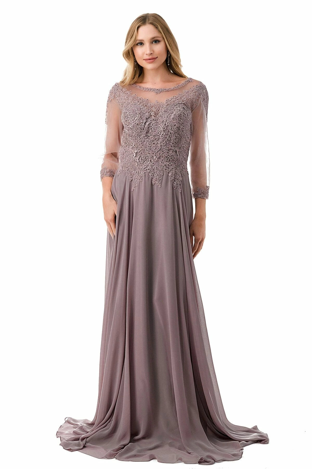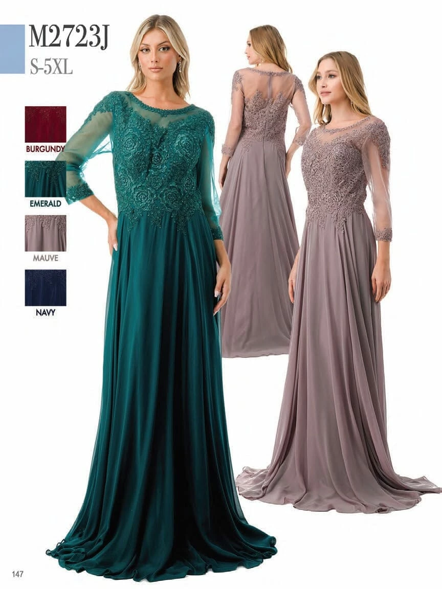 - Lace Applique 3/4 Sleeve A-line Gown by Coya Collection M2723J