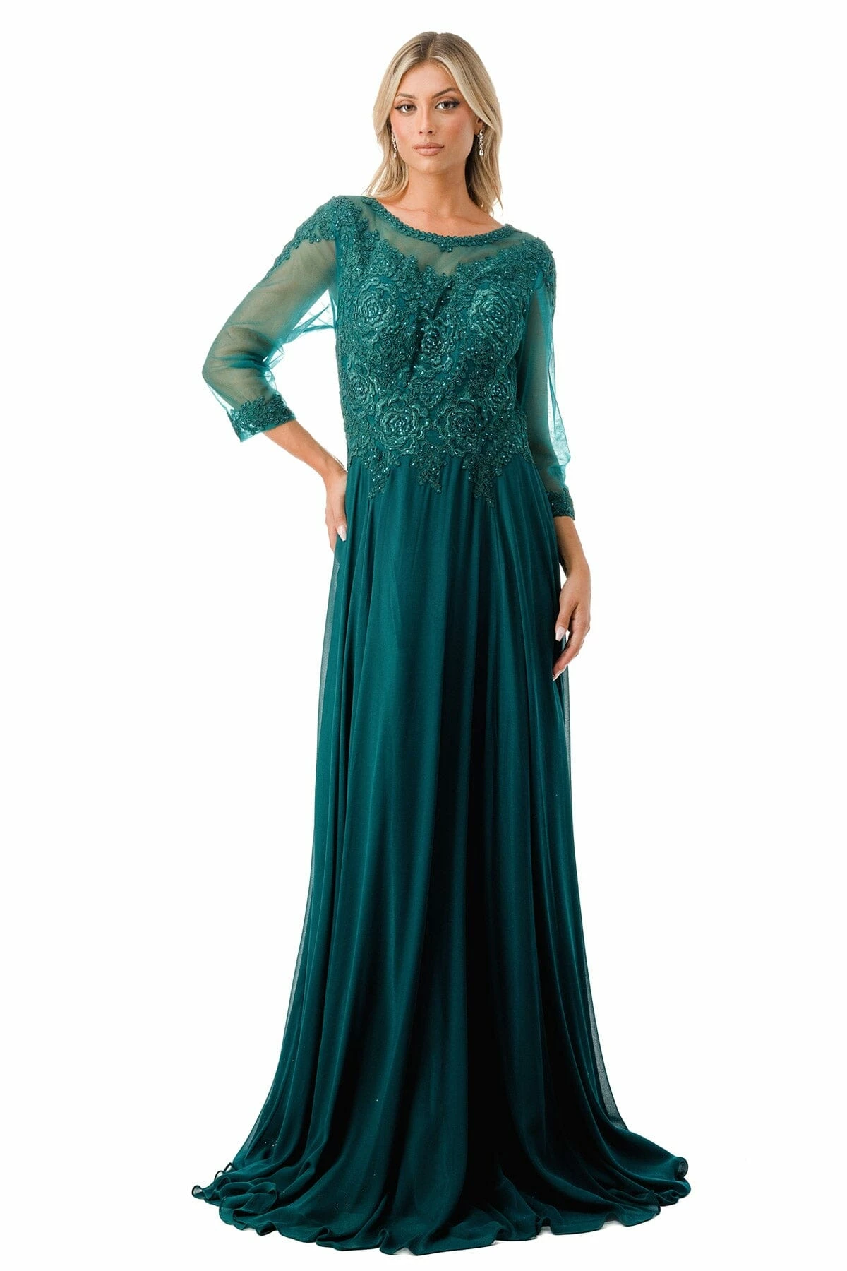 Look unforgettable in this beaded lace applique long 3/4 sleeve dress with A-line chiffon skirt from Coya Collection by Aspeed Design M2723J.