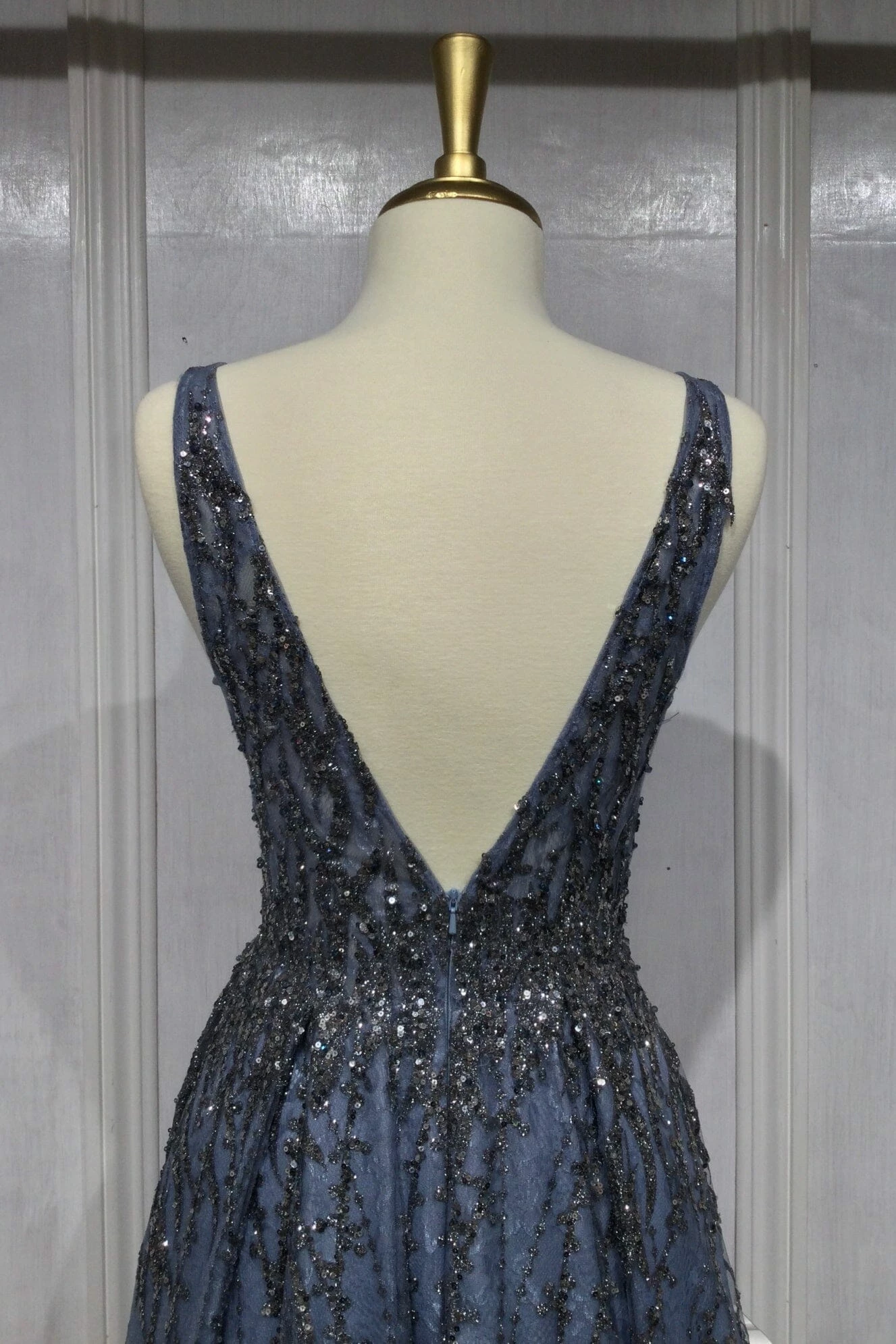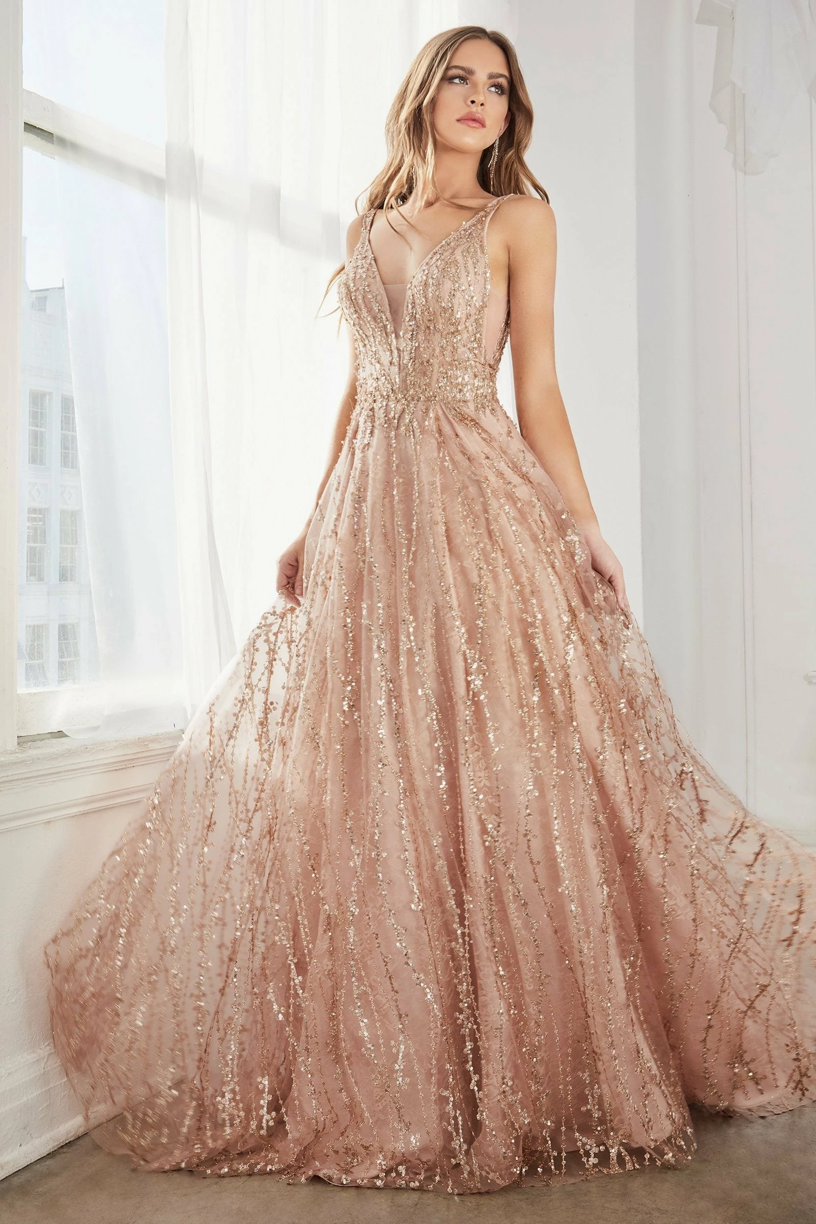 Be the center of attention in this long glittered lace dress with open back by Cinderella Divine C32.