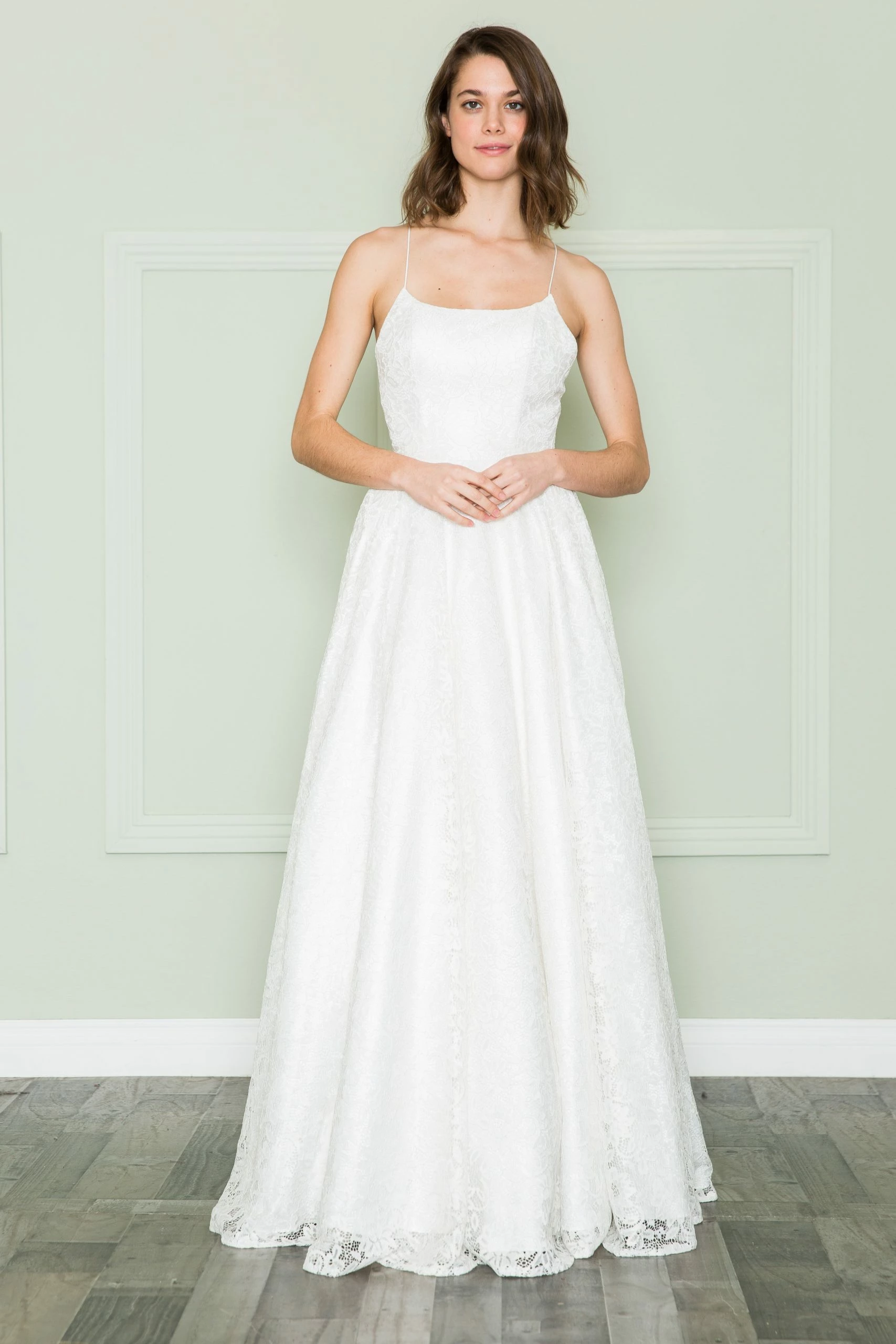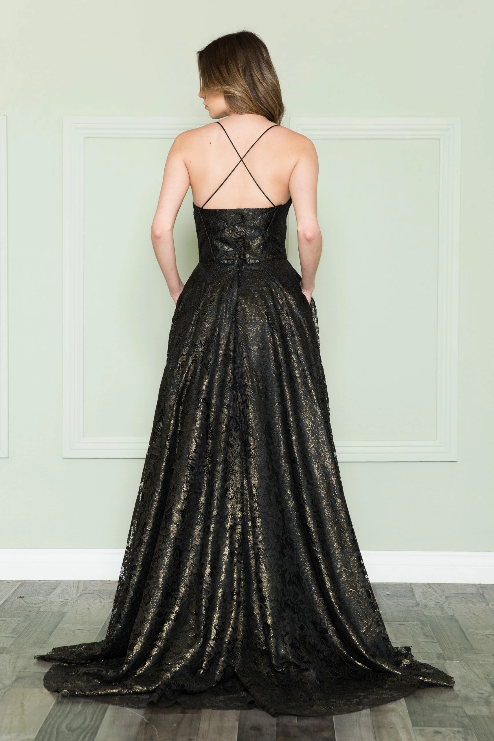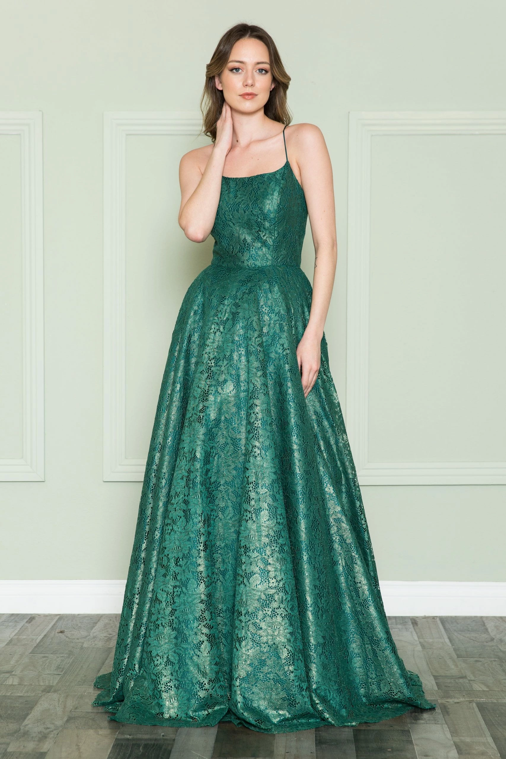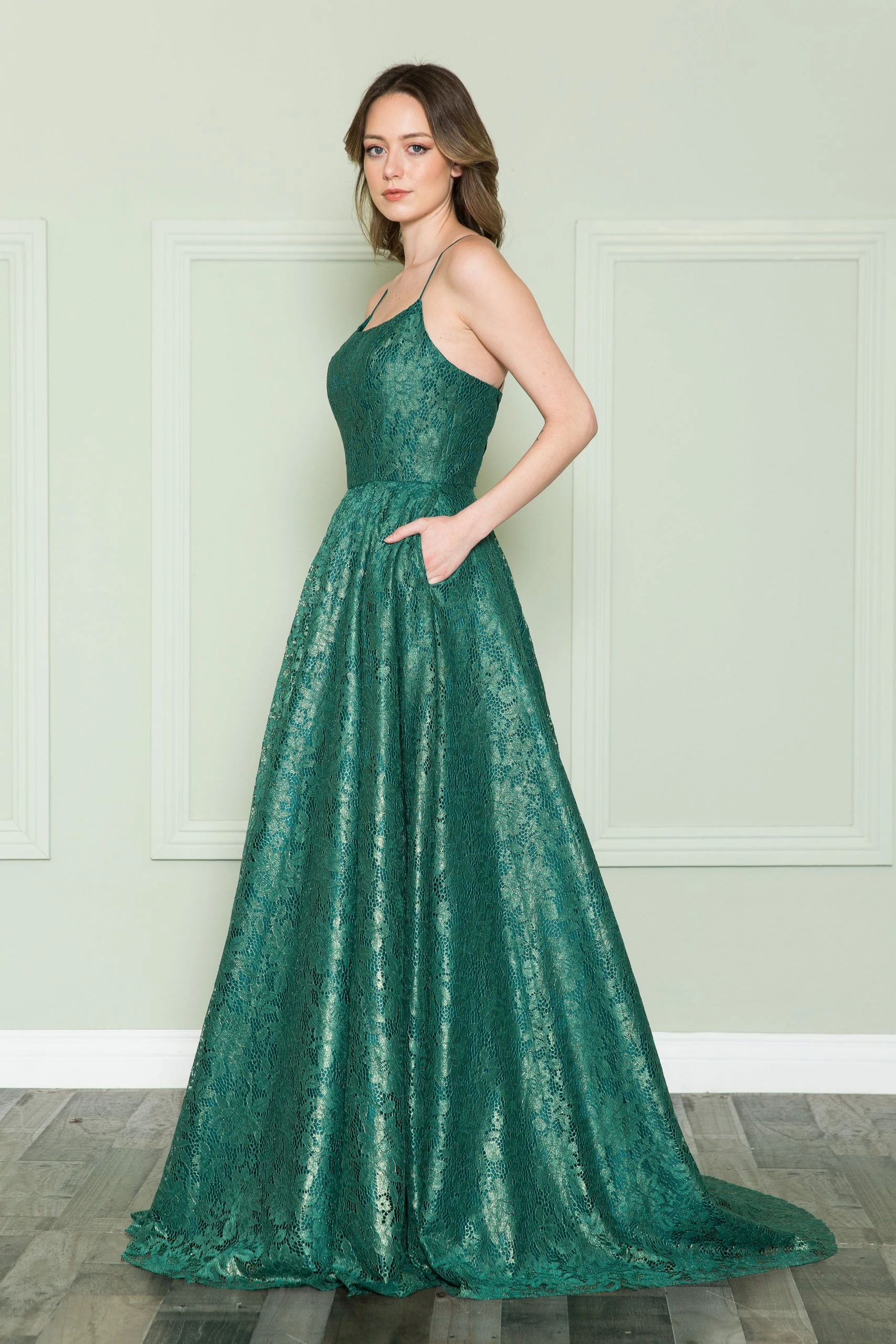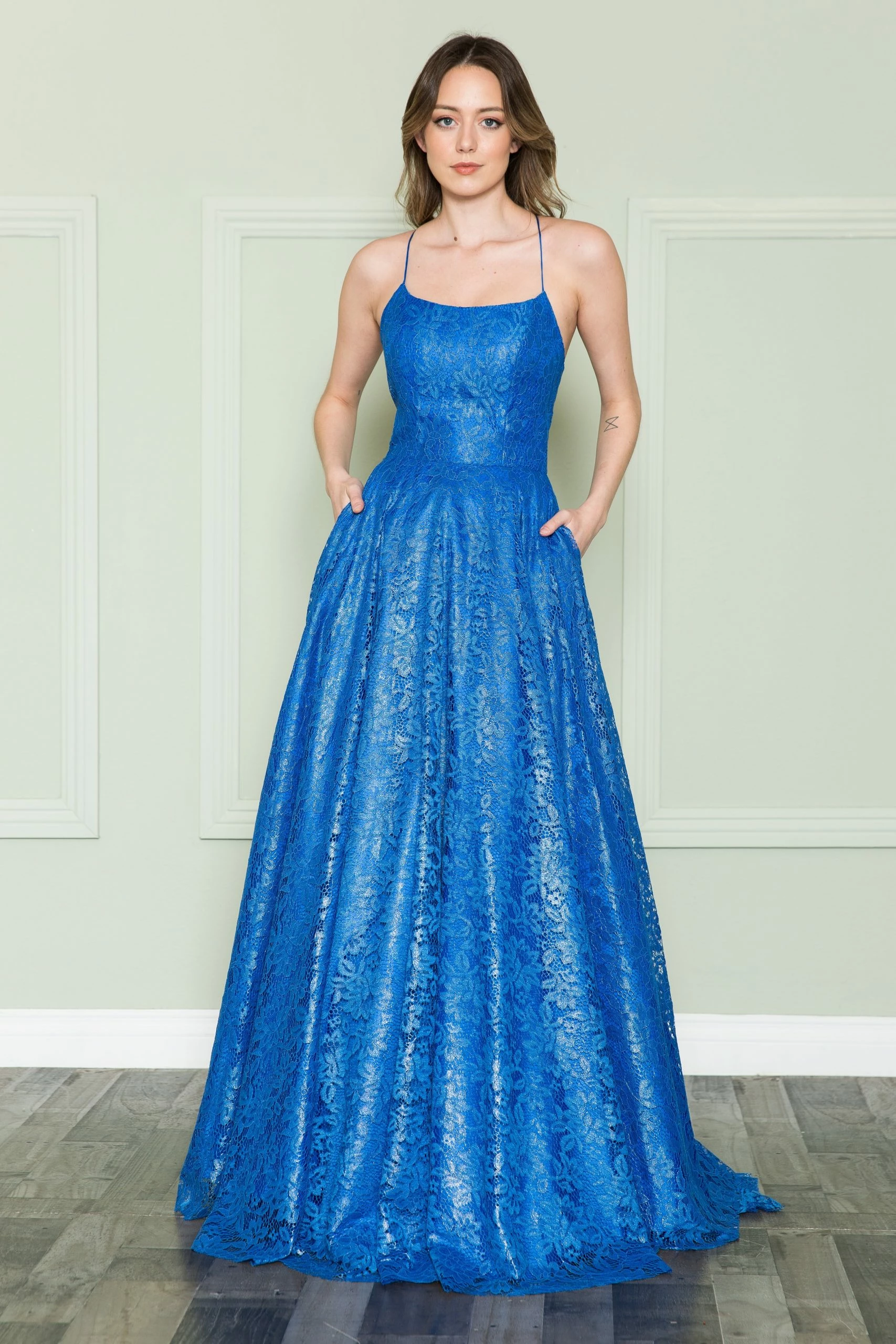 Take plenty of selfies in this long sleeveless lace A-line dress by Poly USA 8862. This beautiful lace gown features a round neckline bodice supported with spaghetti straps, lace-up back with adjustable straps, open back, floor length form fitting skirt with a sweep train, and a zipper closure.