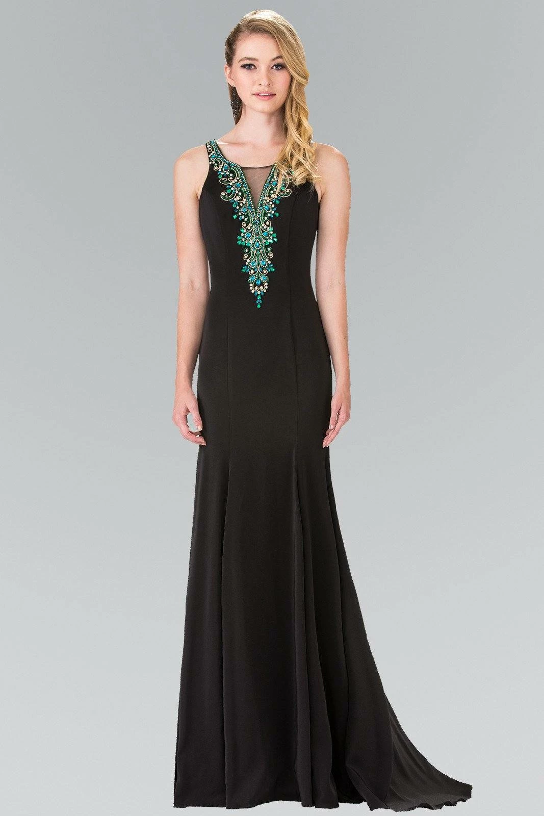 Command attention in this long beaded illusion jersey dress by Elizabeth K. Made out of tulle, this beautiful illusion gown features a amazing beading and a sheer neckline.